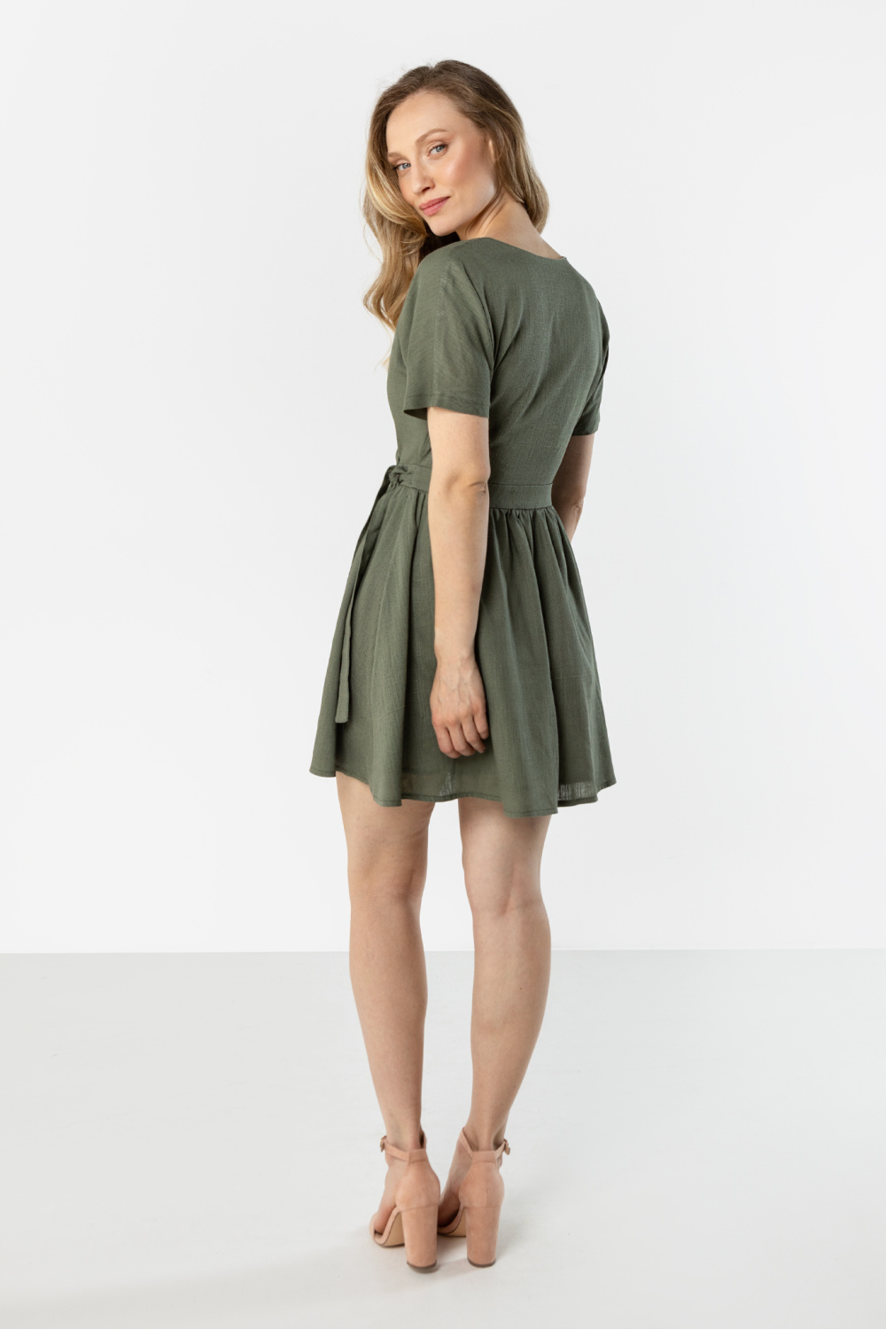 Een lichte mini-jurk met een wikkelmodel is een ideale keuze voor warme dagen. De V-hals benadrukt subtiel de nek en geeft de styling een vrouwelijk karakter, terwijl het strikken in de taille de silhouet mooi vormgeeft. Korte mouwen zorgen voor draagcomfort, terwijl de wijd uitlopende zoom lichtheid en vrijheid toevoegt. De natuurlijke, linnen stof zorgt ervoor dat het model perfect is voor dagelijks gebruik en zomerse uitstapjes.