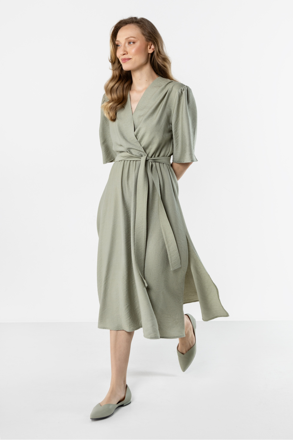 De lichte midi-jurk met een wikkelmodel is een ideale keuze voor zowel dagelijks gebruik als voor meer elegante gelegenheden. De V-hals benadrukt de nek op een mooie manier en geeft de silhouet een subtiele lichtheid. Het strikken in de taille benadrukt het figuur en past de stijl aan het silhouet aan, terwijl de uitlopende onderkant zich zachtjes beweegt en zorgt voor bewegingsvrijheid en een vrouwelijke uitstraling. De korte, losse mouwen voegen een vleugje delicatesse toe, terwijl de luchtige vorm ervoor zorgt dat de jurk er zowel elegant als comfortabel uitziet.