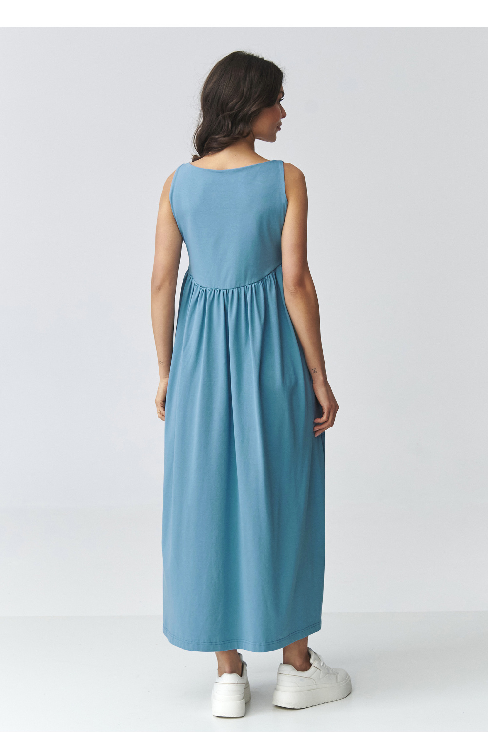 Een stijlvolle maxi-jurk met een losse pasvorm is een ideale keuze voor vrouwen die comfort en tijdloos design waarderen. Het model heeft subtiel uitlopende onderkant en opvallende splitten aan de zijkanten die lichtheid geven en de silhouet benadrukken. De gladde vorm zorgt ervoor dat de jurk perfect is voor zowel dagelijks gebruik als meer elegante styling. Het luchtige materiaal zorgt voor comfort gedurende de hele dag, terwijl de losse pasvorm bewegingsvrijheid garandeert. Praktische zakken verhogen de functionaliteit, en het bedekte bovenstuk met lichte plooien in de taille modelleert subtiel de proporties van het silhouet. Het is een veelzijdige lange jurk voor dames die je gemakkelijk kunt combineren met zowel sportieve schoenen als meer elegante accessoires. Ideaal voor een wandeling, een ontmoeting, een vakantie of dagelijkse uitstapjes.