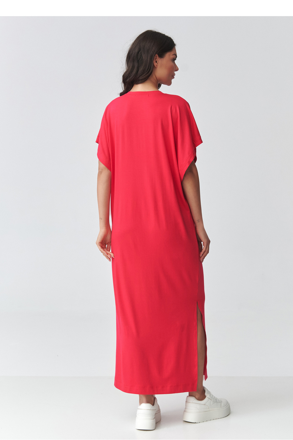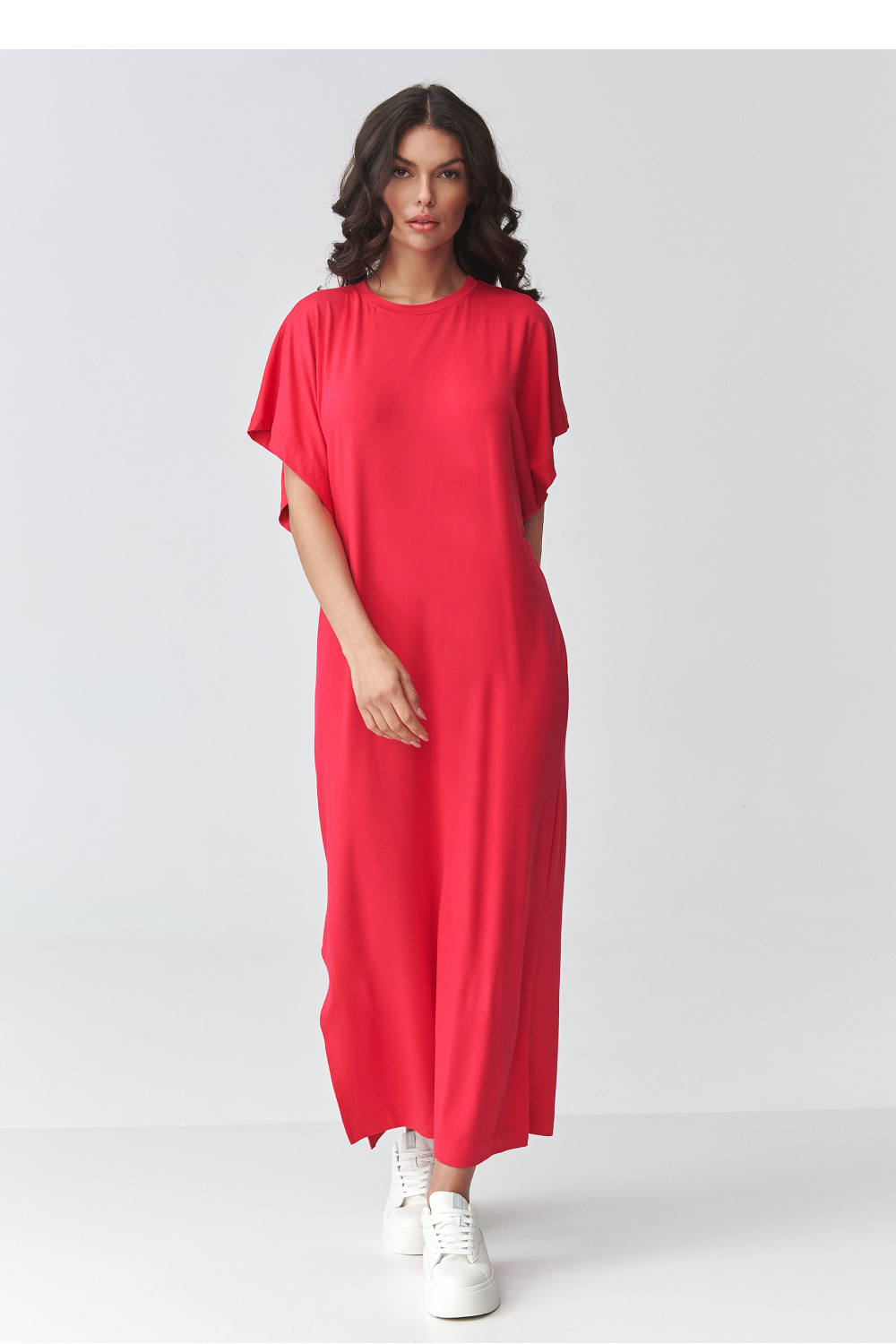 De stijlvolle oversized maxi-jurk is een perfecte combinatie van comfort en modern minimalisme. Het losse model zorgt voor bewegingsvrijheid, terwijl de eenvoudige snit ervoor zorgt dat het model goed past bij verschillende lichaamstypes. Het is een ideale keuze voor vrouwen die comfort en tijdloze stijl waarderen. Het model heeft een klassieke, gesloten halslijn en korte, wijde mouwen die het casual karakter van de styling benadrukken. De maxi-lengte in combinatie met de opvallende split aan de zijkant geeft een luchtig gevoel en benadrukt subtiel het been, wat het geheel een vrouwelijke uitstraling geeft. Het zachte, aangename materiaal zorgt ervoor dat de jurk voor dames zich zowel op het werk als tijdens wandelingen of bijeenkomsten met vrienden zal bewijzen. Het is een veelzijdige lange jurk met een split die op verschillende manieren gestyled kan worden, met sneakers voor een sportieve look of met elegante accessoires voor een chiquer effect. Dankzij de eenvoudige snit vormt het een uitstekende basis voor het creëren van modieuze outfits gedurende het hele seizoen.