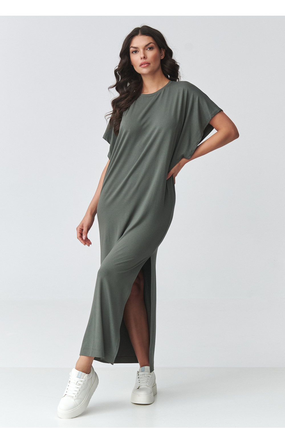De stijlvolle oversized maxi-jurk is een perfecte combinatie van comfort en moderne minimalisme. Het losse model zorgt voor bewegingsvrijheid, terwijl de eenvoudige snit ervoor zorgt dat het model goed past bij verschillende lichaamstypes. Het is een ideale keuze voor vrouwen die comfort en tijdloze stijl waarderen. Het model heeft een klassieke, hoge halslijn en korte, wijde mouwen die de casual uitstraling van de styling benadrukken. De maxi-lengte in combinatie met een opvallende split aan de zijkant geeft lichtheid en benadrukt subtiel het been, waardoor het geheel een vrouwelijke uitstraling krijgt. Het zachte, aangename materiaal maakt dat de jurk perfect is voor dagelijks gebruik, zowel op het werk als tijdens wandelingen of bijeenkomsten met vrienden. Het is een veelzijdige lange jurk met split, die op verschillende manieren gestyled kan worden, met sneakers voor een sportieve look of met elegante accessoires voor een chiquer effect. Dankzij de eenvoudige snit is het een uitstekende basis voor het creëren van modieuze outfits gedurende het hele seizoen.