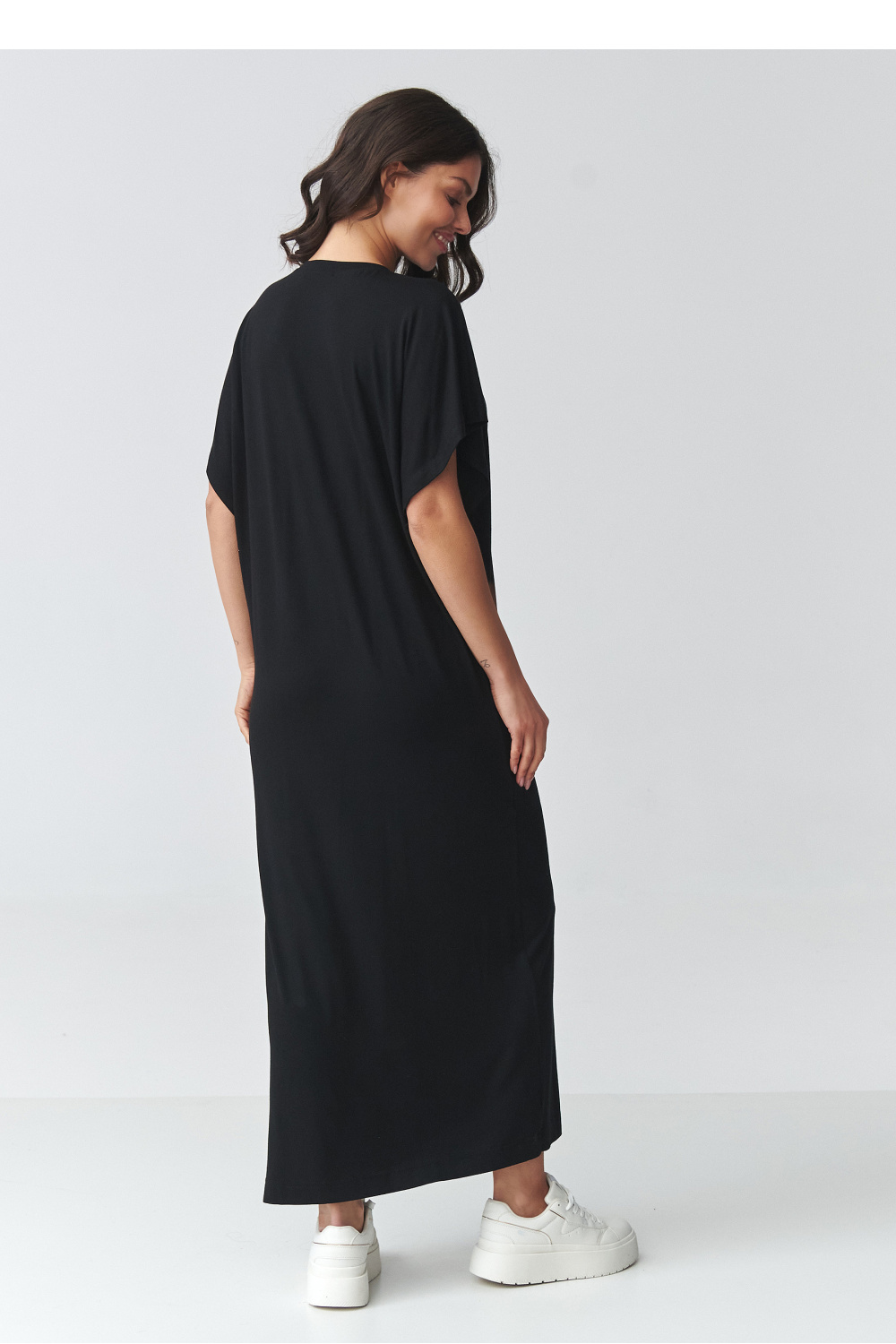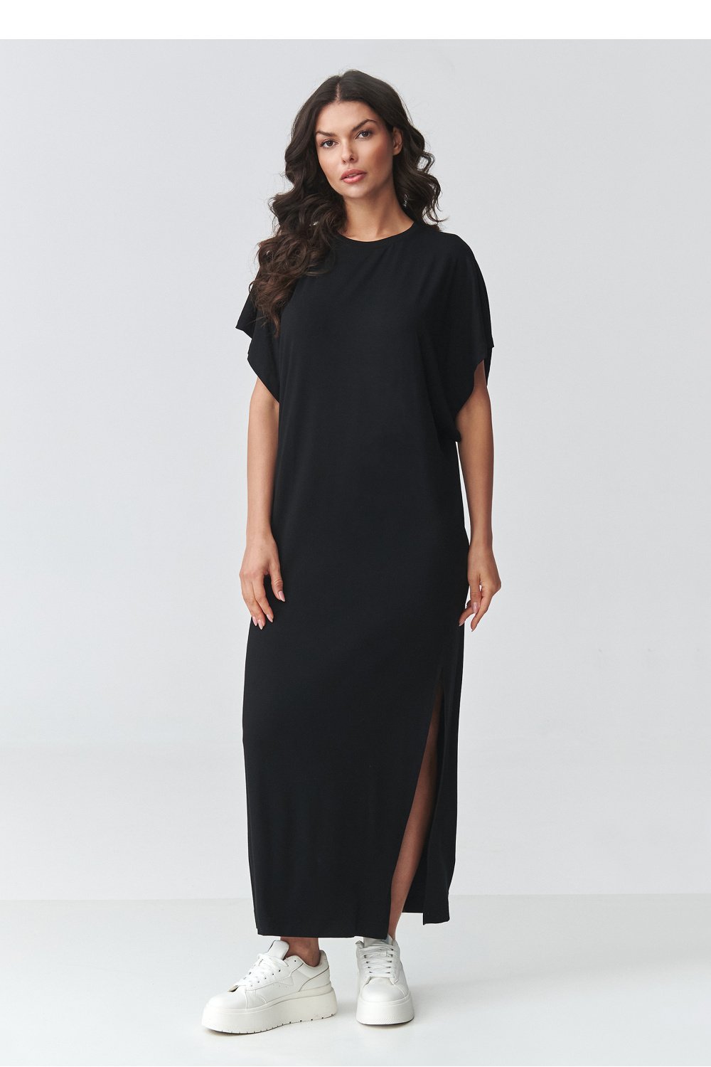 De stijlvolle oversized maxi-jurk is een perfecte combinatie van comfort en moderne minimalisme. Het losse model zorgt voor bewegingsvrijheid, terwijl de eenvoudige snit ervoor zorgt dat het model goed past bij verschillende lichaamstypes. Het is een ideale keuze voor vrouwen die comfort en tijdloze stijl waarderen. Het model heeft een klassieke, bedekte halslijn en korte, wijde mouwen die het casual karakter van de styling benadrukken. De maxi-lengte in combinatie met een opvallende split aan de zijkant voegt lichtheid toe en benadrukt subtiel het been, waardoor het geheel een vrouwelijke uitstraling krijgt. Het zachte, aangename materiaal zorgt ervoor dat de jurk voor dames geschikt is voor zowel werk als voor wandelingen of bijeenkomsten met vrienden. Het is een veelzijdige lange jurk met een split die op verschillende manieren gestyled kan worden, met sneakers voor een sportieve look of met elegante accessoires voor een chiquer effect. Dankzij de eenvoudige snit vormt het een uitstekende basis voor het creëren van modieuze outfits gedurende het hele seizoen.