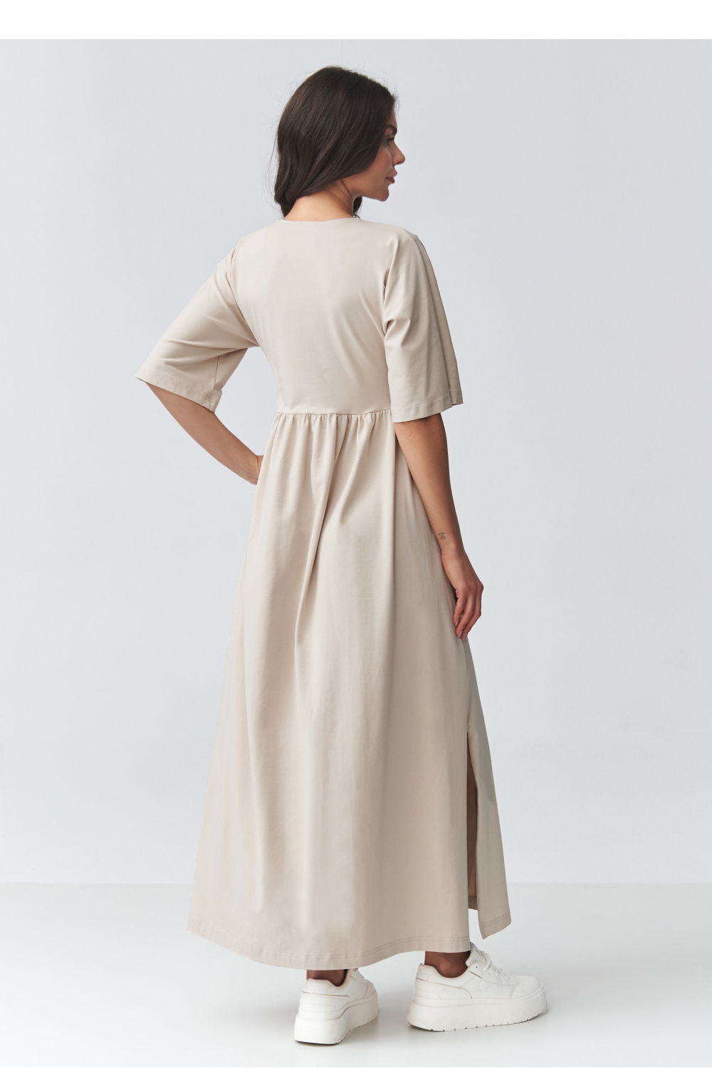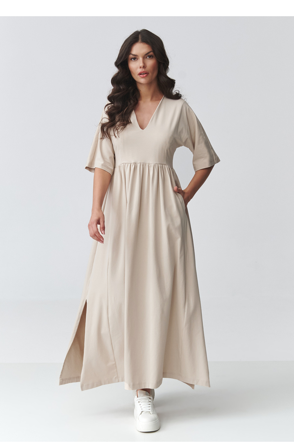 De stijlvolle maxi-jurk is de perfecte combinatie van comfort en tijdloze elegantie. Haar losse, relaxte pasvorm valt prachtig op het silhouet en zorgt voor comfortabel dragen gedurende de hele dag. De delicate V-hals benadrukt subtiel de neklijn, terwijl de tailleband onder de borst het geheel lichtheid en vrouwelijkheid geeft. De lange jurk is gemaakt van aangenaam aanvoelende, ademende stof die zowel geschikt is voor warmere dagen als voor gelaagde looks. De korte mouwen en de splitten aan de zijkanten geven haar een moderne uitstraling en zorgen voor bewegingsvrijheid. De jurk past perfect bij accessoires, van sportieve sneakers tot elegante sandalen of enkellaarzen. Het is een veelzijdige damesjurk die geschikt is voor vele gelegenheden, van werk tot wandelingen, ontmoetingen met vrienden of vakanties.