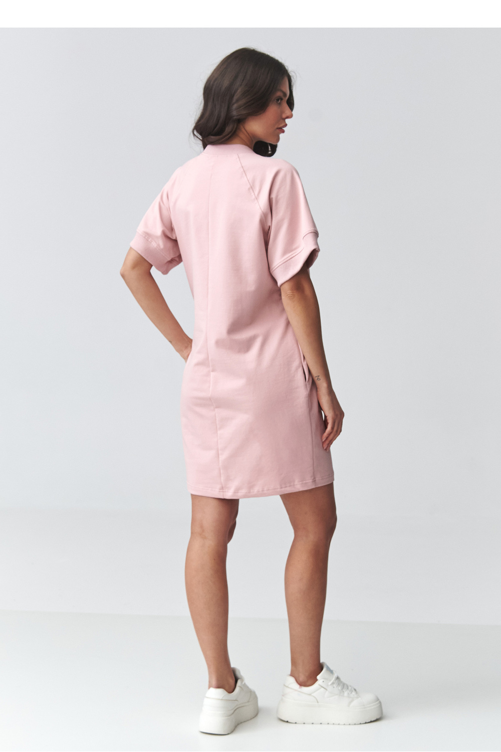 Een stijlvol en uitzonderlijk comfortabel oversized sweatshirt jurk is de perfecte keuze voor vrouwen die comfort en een modieuze uitstraling waarderen. Het losse model zorgt voor volledige bewegingsvrijheid, terwijl de minimalistische snit ervoor zorgt dat het model perfect past bij dagelijkse outfits. Het model heeft korte mouwen en een klassieke, gesloten halslijn, wat het een universeel karakter geeft. Een extra voordeel zijn de praktische zakken aan de zijkanten, die de functionaliteit en het comfort van het gebruik vergroten. De juiste lengte zorgt ervoor dat de jurk er geweldig uitziet, zowel solo als in combinatie met favoriete accessoires. Dit is een uitstekende casual jurk voor dagelijks gebruik, perfect voor wandelingen, winkelen, reizen of informele bijeenkomsten. Je kunt het dragen met sneakers, gympen of meer elegante schoenen, waardoor je verschillende outfits kunt creëren.