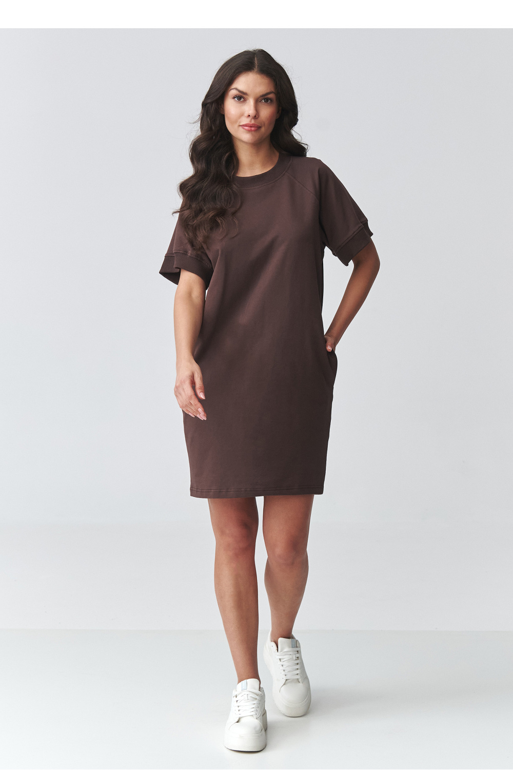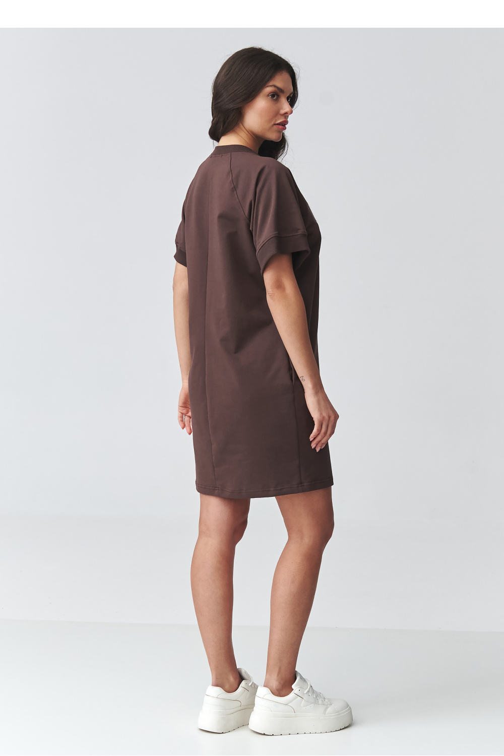De stijlvolle en uiterst comfortabele oversized joggingjurk is de perfecte keuze voor vrouwen die comfort en een trendy uitstraling waarderen. Het losse model zorgt voor volledige bewegingsvrijheid, terwijl het minimalistische ontwerp ervoor zorgt dat het model perfect past bij dagelijkse styling. Het model heeft korte mouwen en een klassieke hoge halslijn, wat het een universeel karakter geeft. Een extra voordeel zijn de praktische zakken aan de zijkanten, die de functionaliteit en het draagcomfort vergroten. Door de juiste lengte ziet de jurk er geweldig uit, zowel op zichzelf als in combinatie met favoriete accessoires. Dit is een uitstekende casual jurk voor dagelijks gebruik, ideaal voor wandelingen, winkelen, reizen of informele bijeenkomsten. Je kunt hem dragen met sneakers, gympen of meer elegante schoenen, waardoor je diverse stijlen creëert.