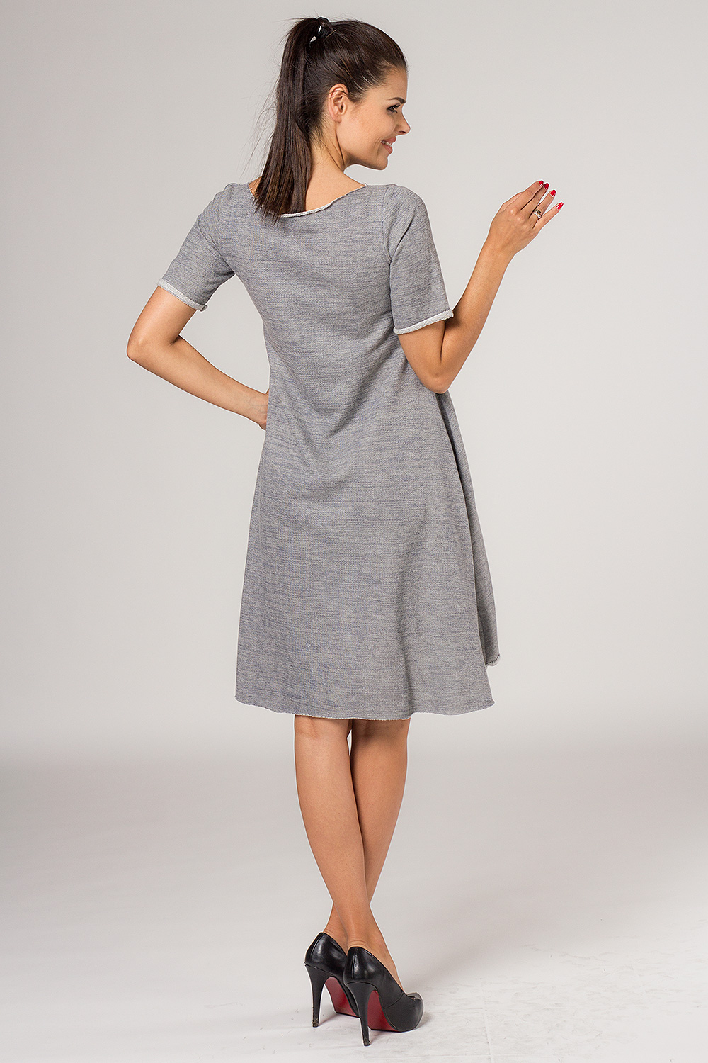 Eenvoudige jurk in grijs, gemaakt van gewatteerde stof. De jurk wordt breder aan de onderkant, met een verlengde rug. Een perfecte keuze voor elke dag en niet alleen. Randen niet afgewerkt.