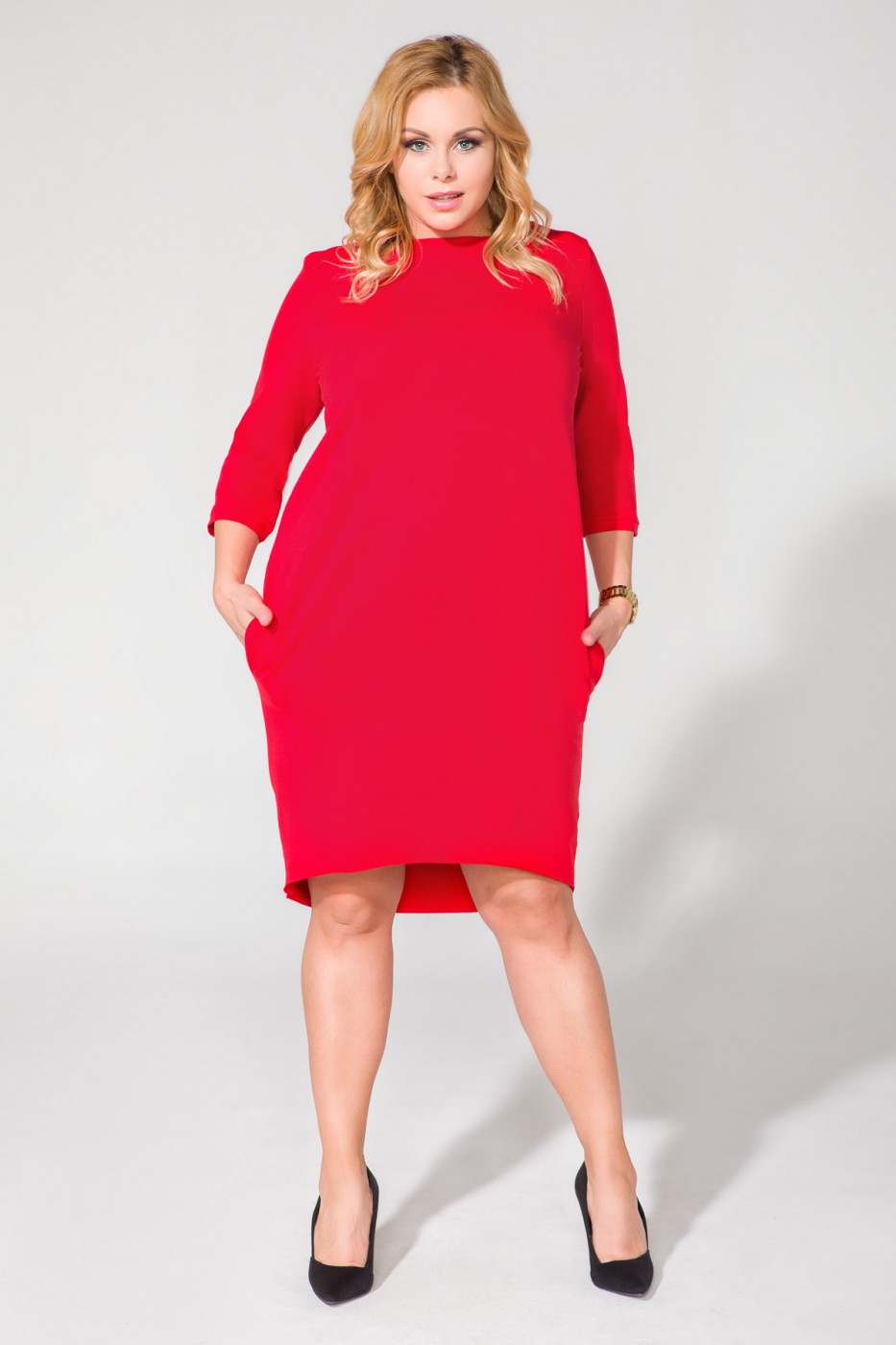 Elegante gebreide jurk met heupzakken. Tuba cut. Mouwen en hals afgewerkt met een boordje. De onderkant van de jurk is rauw. Mouwen 3/4-lengte.