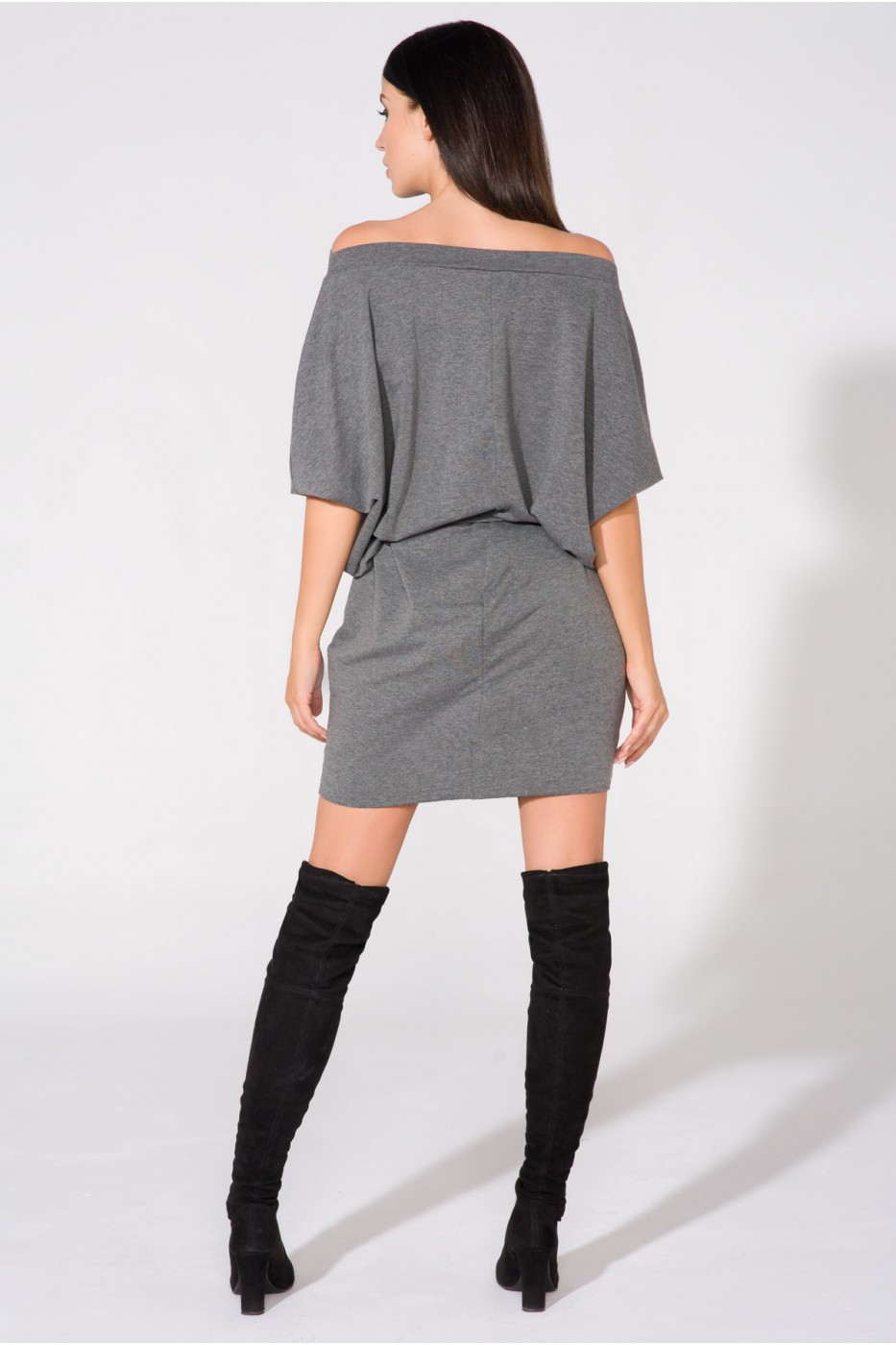 Losjes vallende gebreide jurk met grote zakken aan de voorkant. Boothals afgewerkt met een boordje.