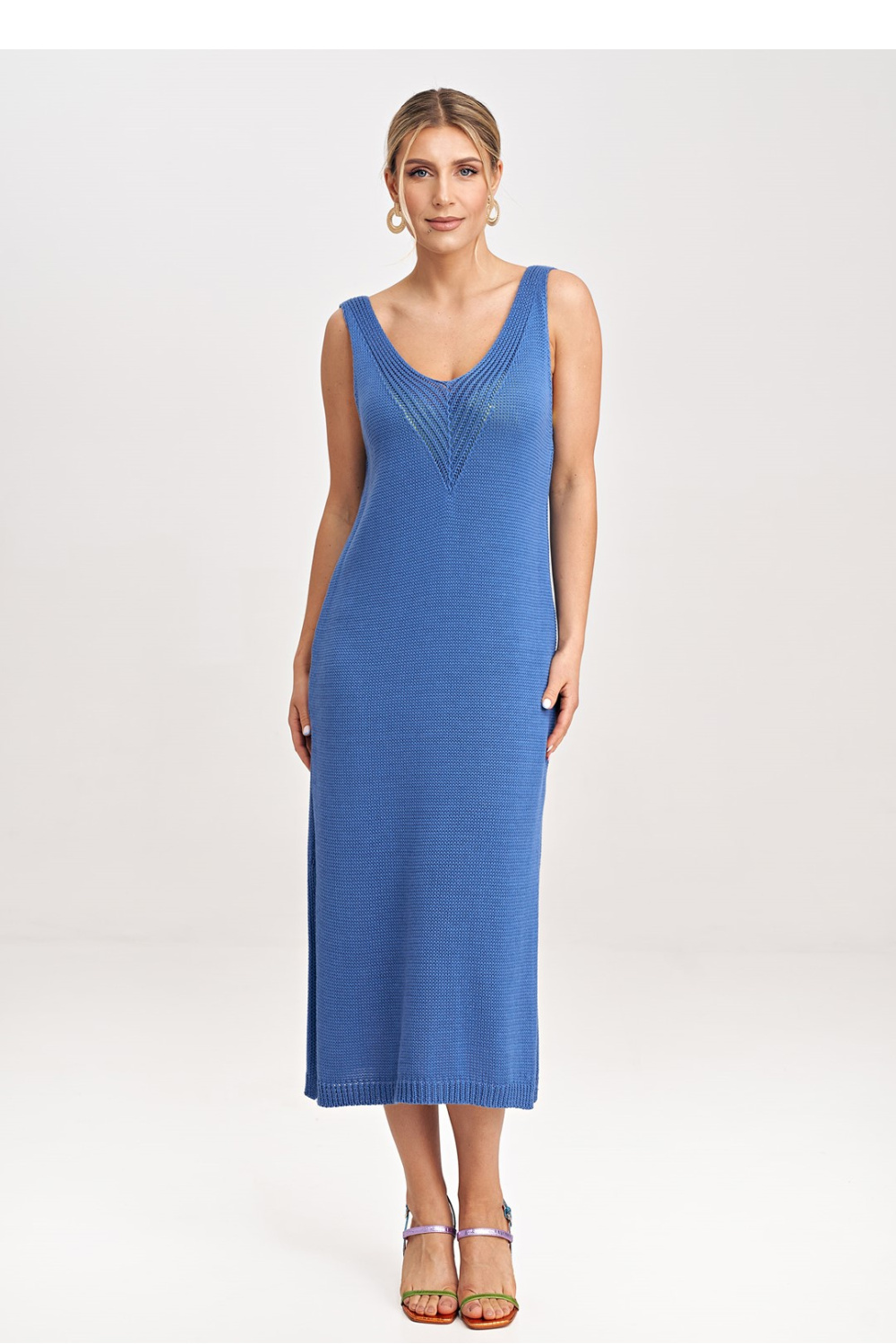 Een tweedelige set bestaande uit een midi-jurk en een bolero. Bolero zonder knoop met lange mouwen en een decoratieve strik aan de voorkant. Jurk met dikke schouderbandjes en diepe halslijn.