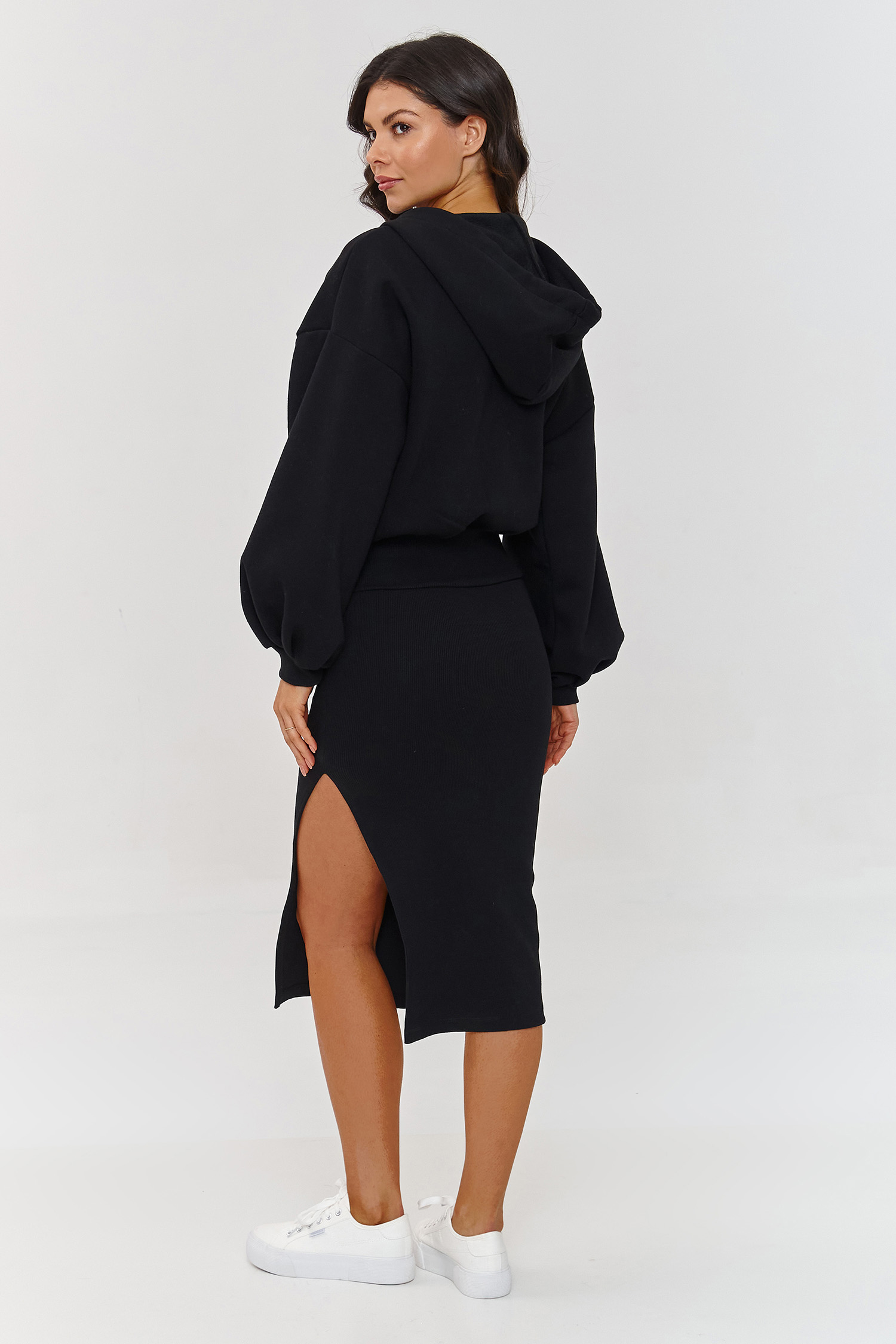 Eén set, veel mogelijkheden! De gestreepte jurk zonder mouwen en de open blouse zijn een combinatie die is gemaakt voor vrouwen die comfort en veelzijdigheid waarderen. Dankzij deze twee elementen kun je je outfit aanpassen aan elk seizoen – draag de jurk in de zomer alleen en voeg op koelere dagen een warme trui toe. De gestreepte jurk past zich aan het lichaam aan, benadrukt de vormen, belemmert de beweging niet en het extra split aan de zijkant voegt vrouwelijkheid en sensualiteit toe. De trui met capuchon heeft een comfortabele sluiting waardoor hij bij veel outfits past. Bovendien is hij gemaakt van dikker sweatstof, waardoor hij zo veelzijdig is dat je hem het hele jaar door kunt dragen als aanvulling op je outfit. De trui is ontworpen in een los, oversized model, wat zorgt voor volledige bewegingsvrijheid. De geribbelde manchetten en onderkant voegen een trendy design toe. Draag de jurk alleen op warmere dagen en geniet van een lichte, vrouwelijke look. Als het kouder wordt, gooi je gewoon de trui met drukknopen eroverheen om een casual, praktische outfit te creëren die perfect is voor werk, wandelen of snelle boodschappen. Je kunt deze elementen samen of apart dragen, gecombineerd met andere kledingstukken zoals sneakers, laarzen of gympen. Deze set past overal bij! Kies een stijlvolle en functionele set die bij jouw levensstijl past!