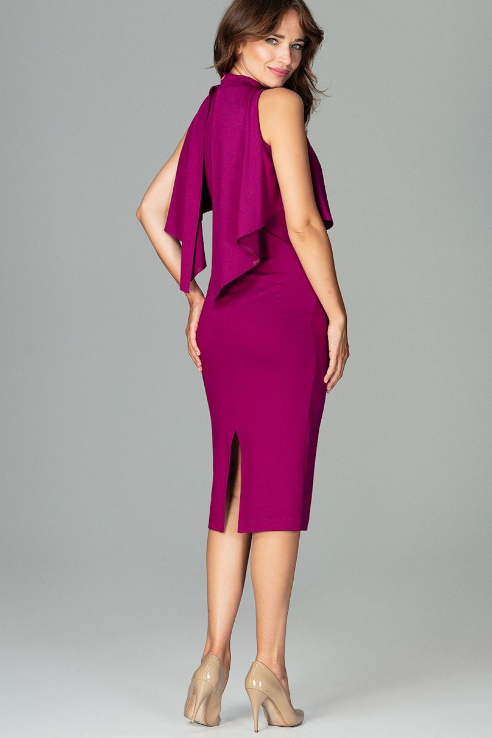 Een getailleerde jurk met een opstaande kraag en aangehechte cape. Ideaal voor grote uitjes en romantische diners. Een bijkomend voordeel is de rug van de cape en een comfortabele snit van de jurk. Sluiting met een verborgen ritssluiting op de rug.
