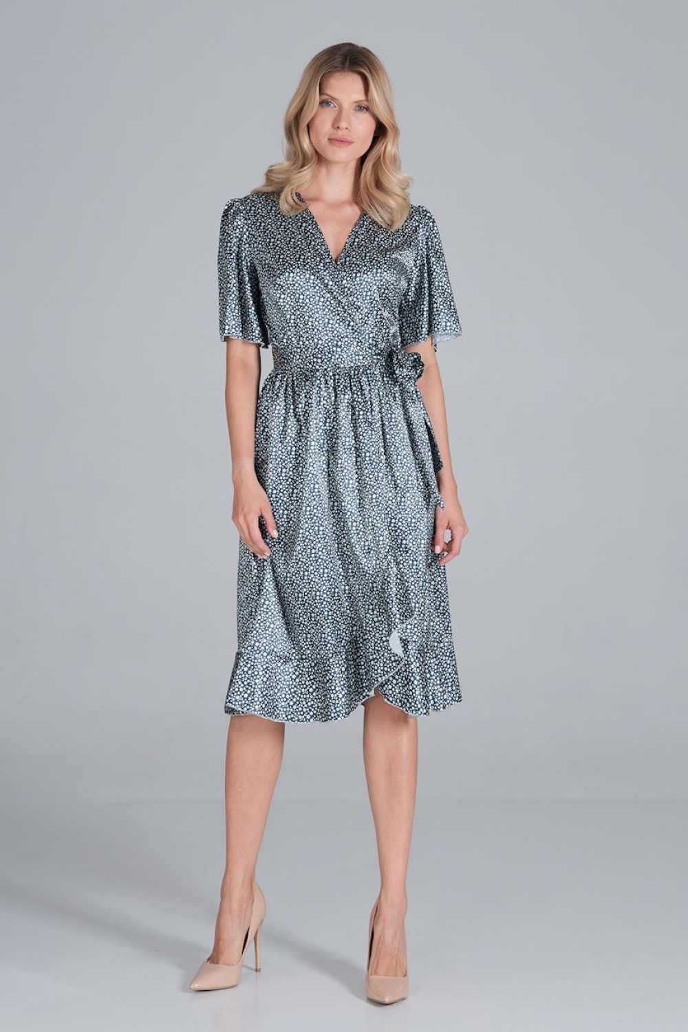 Satijnen enveloppe midi-jurk met wijde korte mouwen, geknoopt in de taille, uitlopende onderkant met een ruche. Jurk is ongevoerd.