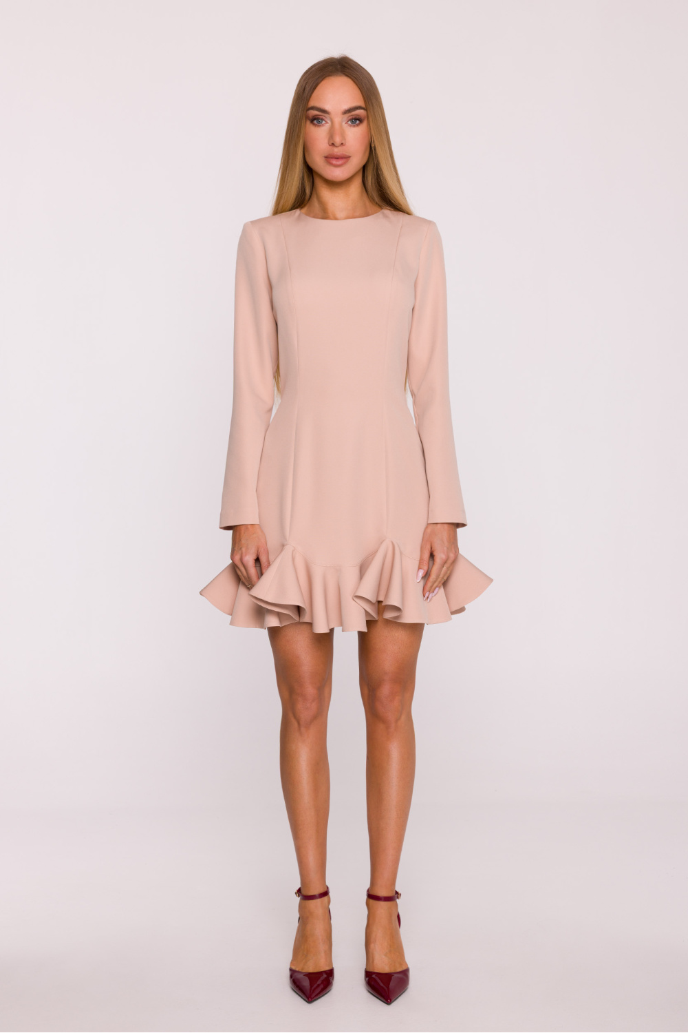 Een subtiele en vrouwelijke jurk gemaakt van gladde stof met een matte afwerking is een uitstekend voorstel voor vele gelegenheden. De eenvoudige vorm is verfraaid met een fantasieruche aan de onderkant, wat het geheel lichtheid en meisjesachtige charme geeft. Het model heeft een klassieke, halfronde halslijn en lange mouwen, waardoor het er elegant en tijdloos uitziet. De verborgen rits aan de achterkant zorgt voor gemak bij het aantrekken en een esthetische afwerking. Het ontbreken van zakken en voering maakt de jurk licht, comfortabel en legt mooi op het lichaam. Het model is ontworpen om subtiel het figuur te benadrukken: de bovenkant heeft een rechte, licht getailleerde lijn met modellerende naden, terwijl de rok wijd uitloopt met een ruche die mooi beweegt tijdens het lopen. De minilengte voegt frisheid en een modern karakter toe aan de outfit. Ontworpen en gemaakt in Polen, met het oog op vrouwen die eenvoudige elegantie waarderen met een vleugje originaliteit.