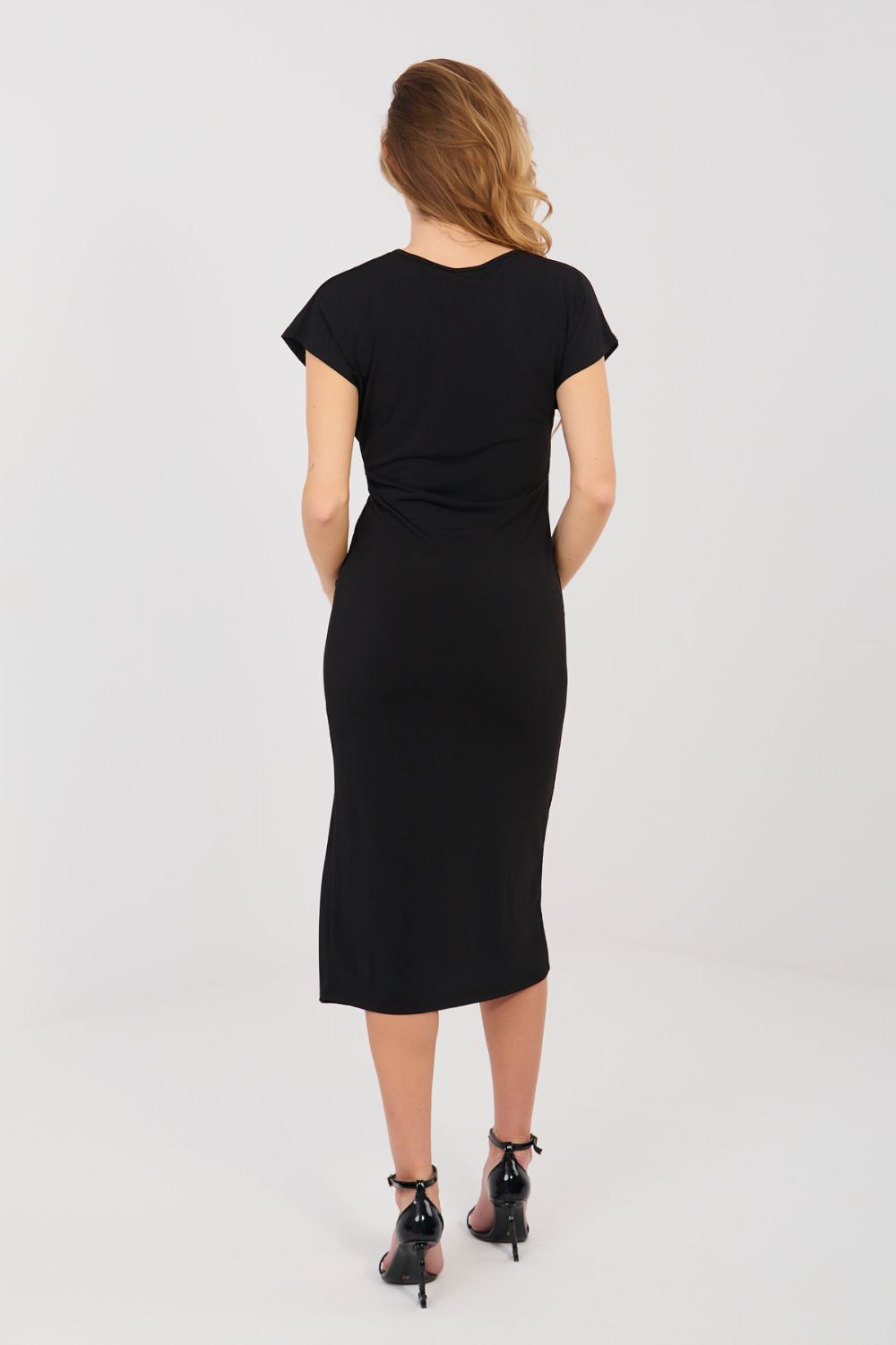 Stijlvolle kokerjurk, ideaal voor feestjes of formele gelegenheden. Gemaakt van een comfortabele mix van polyester en viscose, die mooi valt op het lichaam, zorgt voor lichtheid en elegantie. De jurk heeft een glad patroon, een ronde hals en korte mouwen, en de decoratieve plooien aan de voorkant modelleren subtiel het figuur, waardoor karakter wordt toegevoegd. De split aan de onderkant tot aan de dij voegt een delicate, sensuele touch toe, en de midi-lengte benadrukt de elegantie van de outfit. Het ontbreken van een sluiting maakt de jurk gemakkelijk aan te trekken, en de klassieke kokerjurk benadrukt perfect het vrouwelijke figuur. Dit is een voorstel voor vrouwen die stijl, comfort en subtiele sensualiteit waarderen in één.