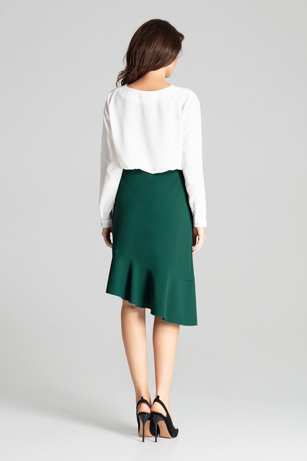 Groene asymmetrische midi rok met een franje. Brede elastische band in de taille. Ongevoerd en zonder zakken.