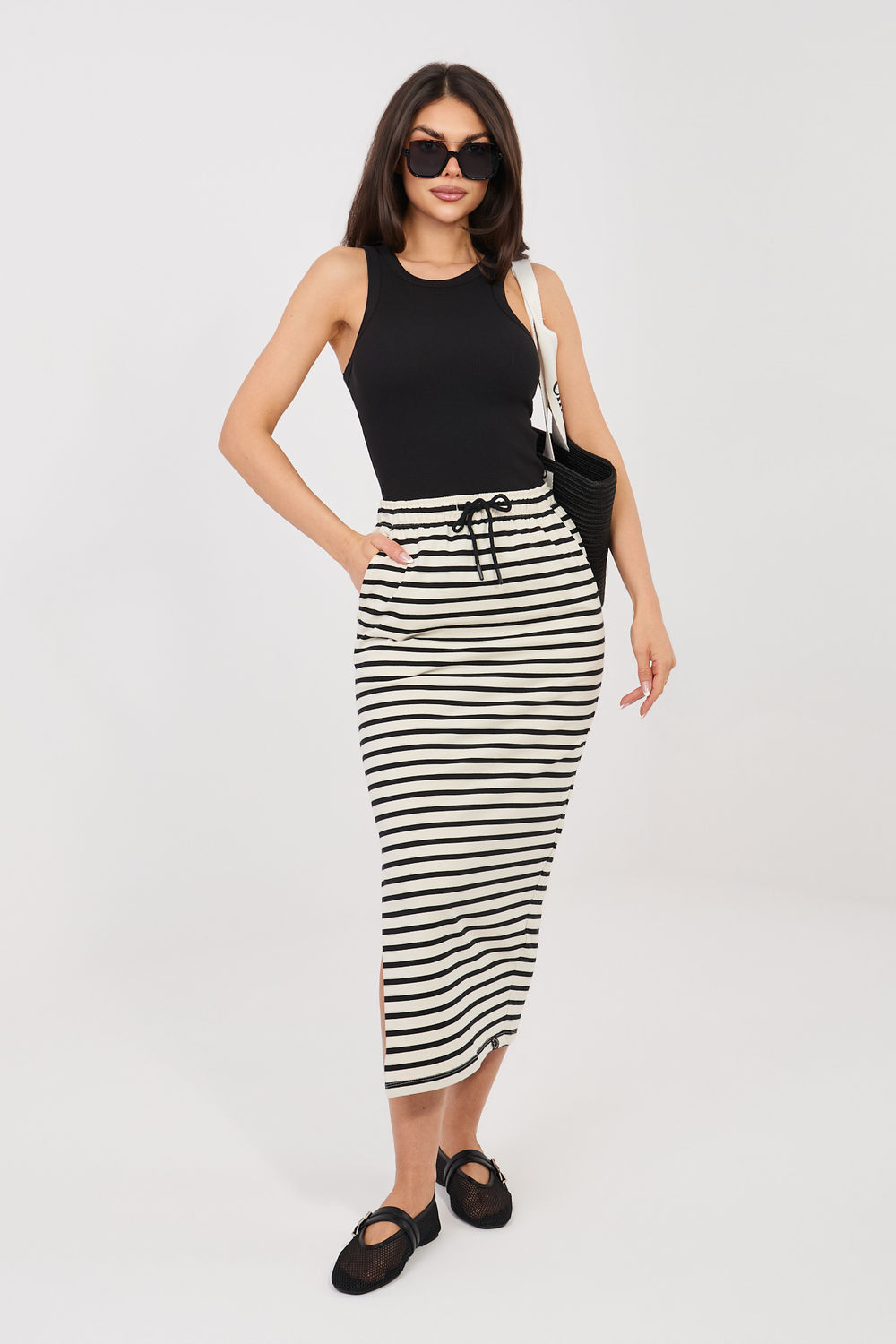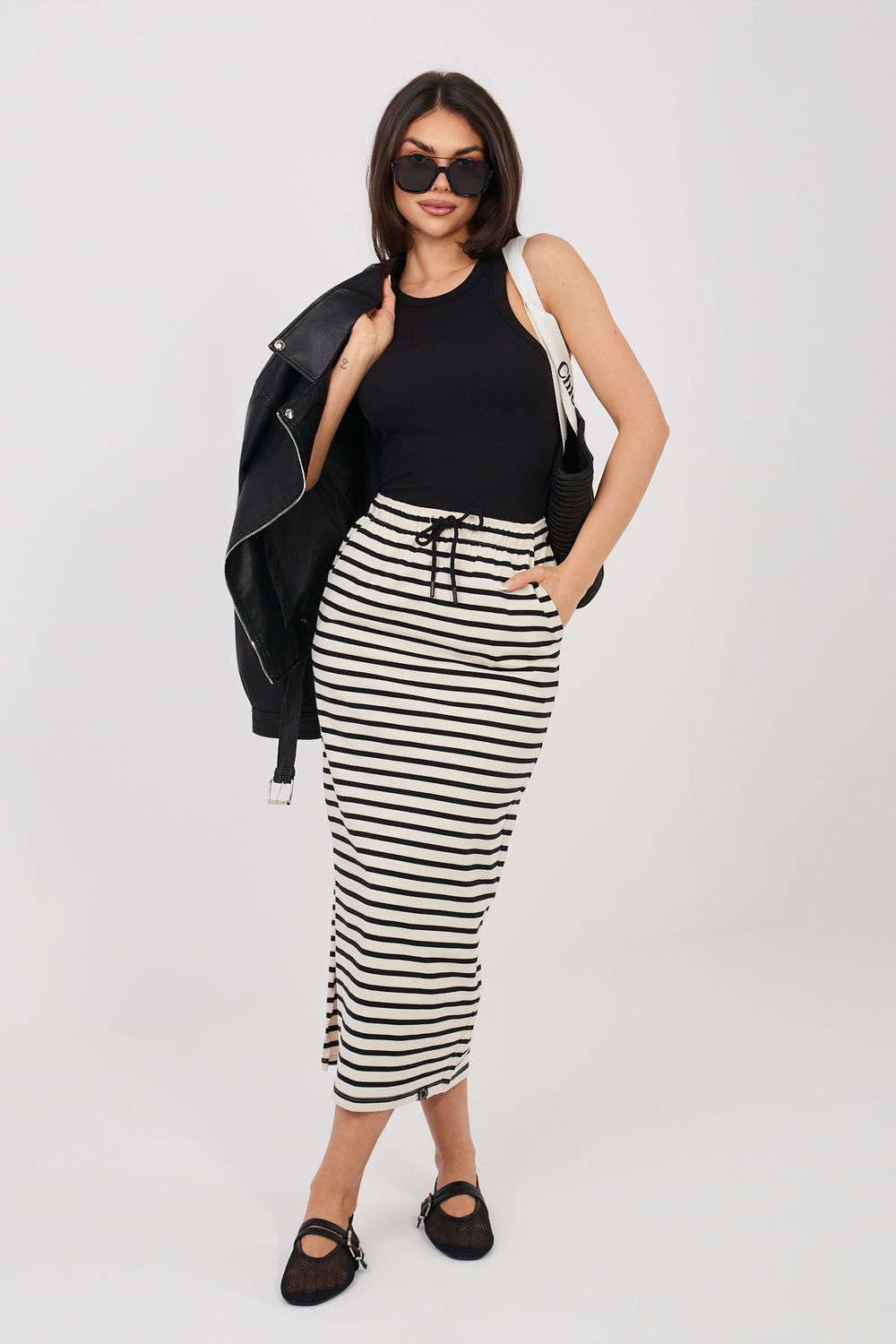 Een stijlvolle damesrok in een casual stijl is een ideale keuze voor dagelijkse styling. Het is geschikt voor een wandeling, winkelen of een ontmoeting met vrienden, en biedt comfort en een modieuze uitstraling. Het model is gemaakt van hoogwaardig katoen, waardoor de stof luchtig, aangenaam voor de huid en comfortabel is om de hele dag te dragen. De rok heeft een midi-lengte, wat het een veelzijdig en vrouwelijk karakter geeft. In de taille is een elastische band ingenaaid die zorgt voor een goede pasvorm en comfortabel gebruik. Een extra element is de strik in de taille, die een decoratieve functie vervult en de taille benadrukt. Het geheel is versierd met een trendy streepjespatroon, dat de rok een lichtheid en zomerse uitstraling geeft. Het model is ook voorzien van handige insteekzakken die de functionaliteit verhogen. Dit is een uitstekende keuze voor dagelijkse styling, waarbij comfort wordt gecombineerd met een tijdloze uitstraling.