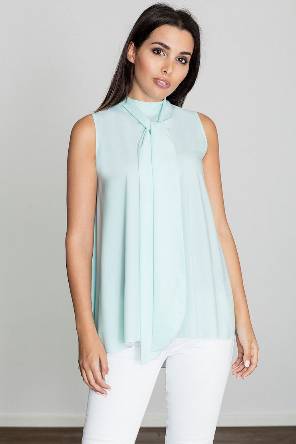 Soepele, uitlopende blouse met open schouders. Decoratieve bandjes aan de voorkant en een blinde ritssluiting aan de achterkant.