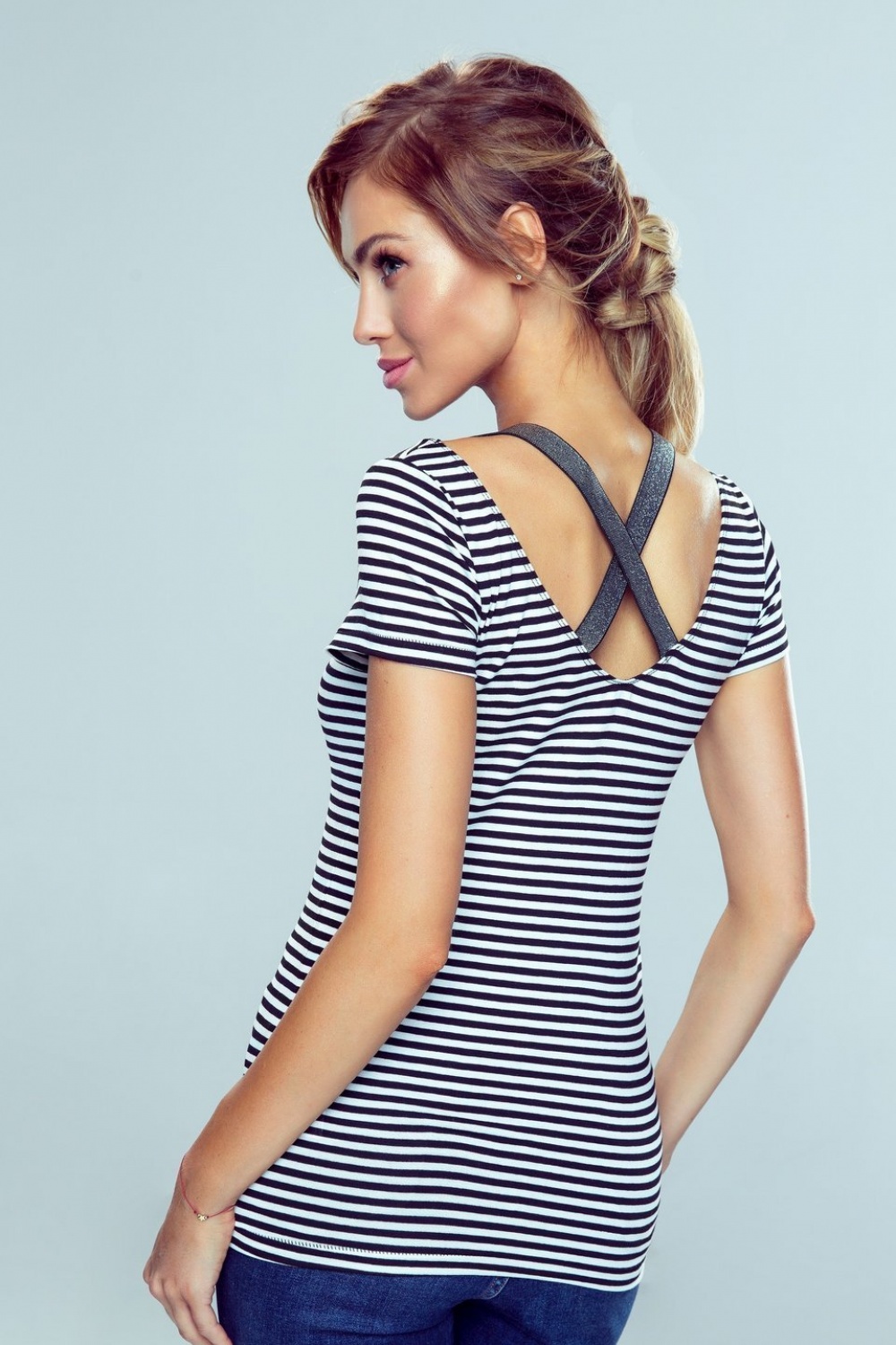 Stijlvolle blouse versierd met zilveren rubberen bandjes, in de vorm van decoratieve, glinsterende schouderbandjes. Perfect met jeans, geïnspireerd door de glam stijl. Zacht, rekbaar katoen in een delicate witte en zwarte krijtstreep.