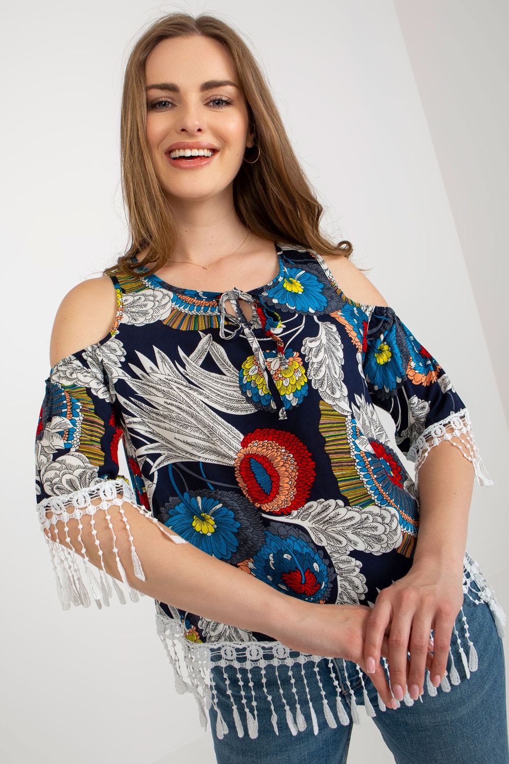 Zomerse blouse van bedrukte stof met 3/4 mouwen en een ronde halslijn. Blouse met bies bij de hals en decoratieve kwastjes.