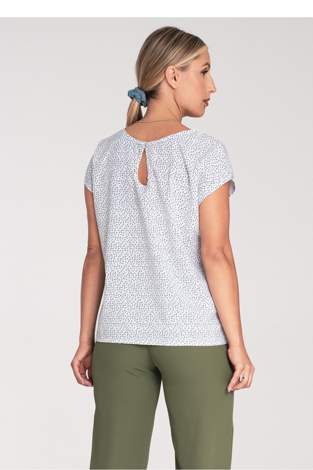 Recht model blouse met korte mouwen. De blouse heeft een ronde hals en een ritssluiting op de rug.
