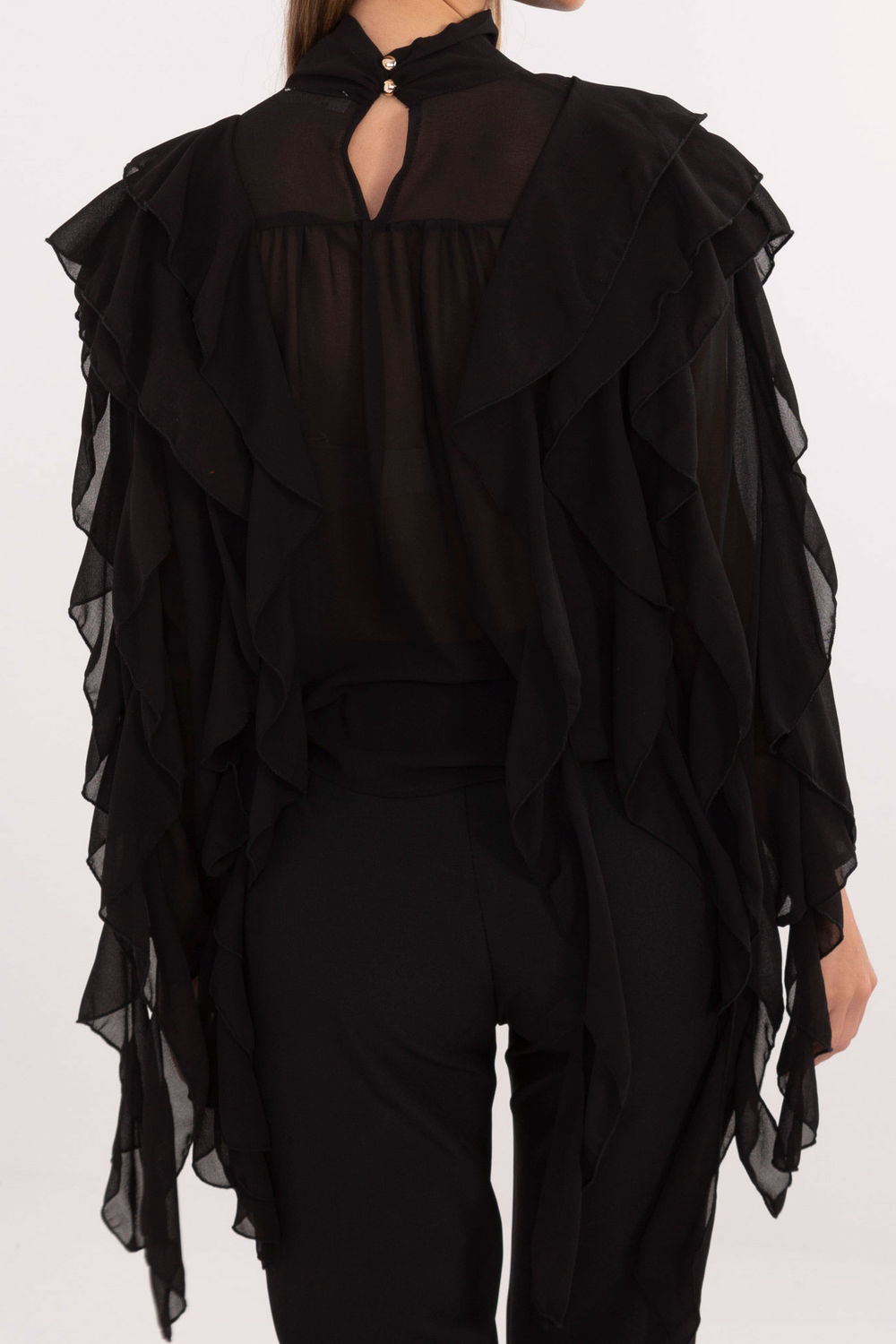 Een elegante damesblouse is de ideale keuze voor dagelijks gebruik, formele gelegenheden en feestjes, wanneer je je stijl wilt benadrukken met een subtiele maar opvallende vorm. Het gladde patroon geeft het geheel een klassieke uitstraling en maakt het gemakkelijk te combineren met zowel elegante broeken als een rok. Het model is gemaakt van een aangename mix van viscose en polyester, waardoor de blouse zacht, licht elastisch en mooi op het lichaam valt. De standaard lengte en lange mouwen zorgen ervoor dat de blouse er elegant en veelzijdig uitziet. De col benadrukt de hals en voegt een vleugje chique mysterie toe, en de knoopsluiting aan de achterkant vergemakkelijkt het aan- en uittrekken en dient als een subtiel decoratief accent. De blouse is ook prachtig door de unieke details, decoratieve ruches op de rug, voorkant en mouwen, die het een lichte, romantische en modieus elegante uitstraling geven. Dit is een uitstekende keuze voor vrouwen die graag subtiele klassieke stijl combineren met opvallende, vrouwelijke afwerkingen.