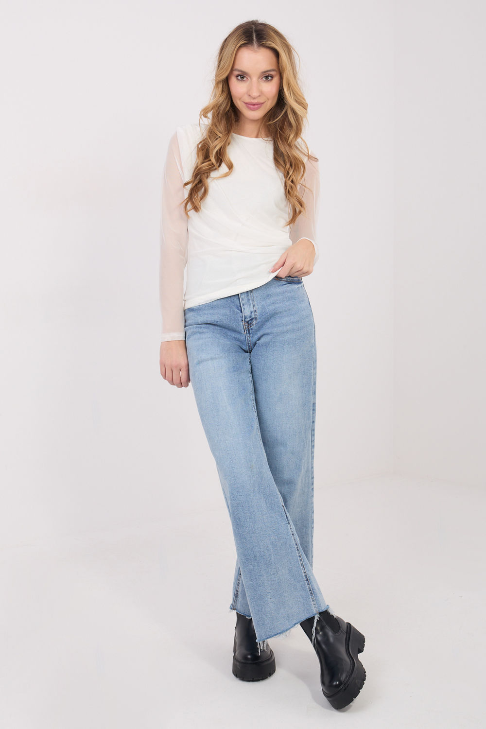 Een elegant shirt van zacht gaas met een aansluitende pasvorm, dat subtiel de silhouet benadrukt en de styling een verfijnd karakter geeft. Gemaakt van een mix van polyester en elastaan, zorgt het voor comfortabel dragen en de elasticiteit van het materiaal. Het model met een glad patroon heeft een klassieke, ronde hals en lange mouwen, die ongevoerd blijven, waardoor een licht en sensueel effect ontstaat. Het shirt heeft een voering op het lichaam, wat comfort en een esthetische afwerking garandeert. Decoratieve plooien voegen elegantie toe en subtiel modelleren het silhouet. De standaardlengte zorgt ervoor dat het shirt perfect is voor zowel werkoutfits, formele gelegenheden als elegante uitstapjes of feestjes.
