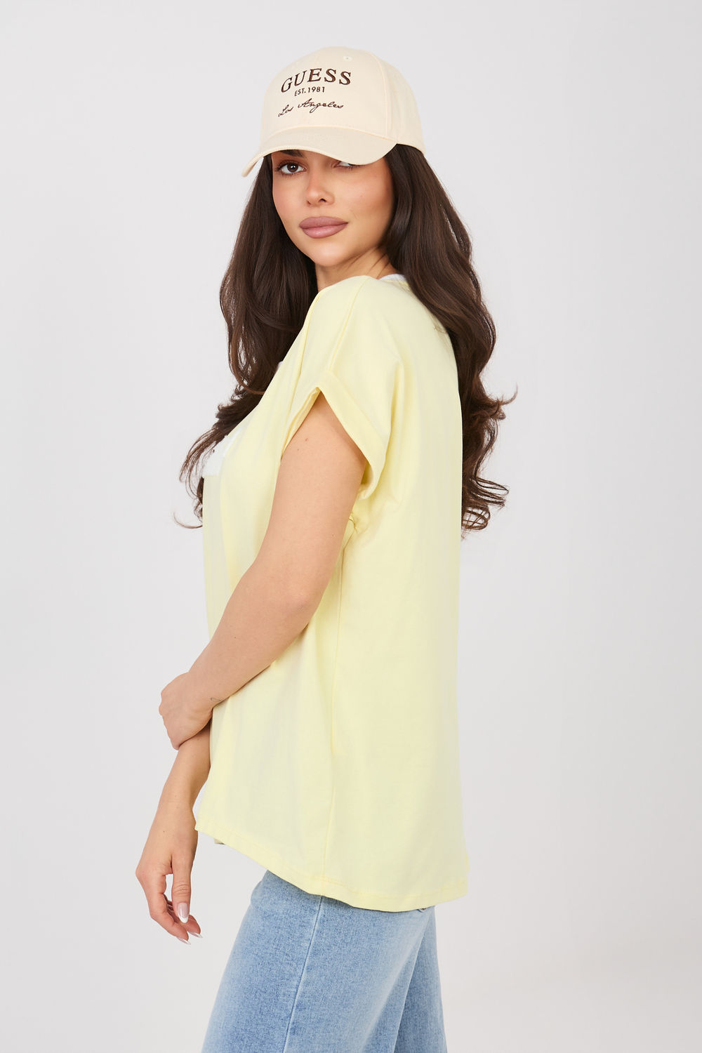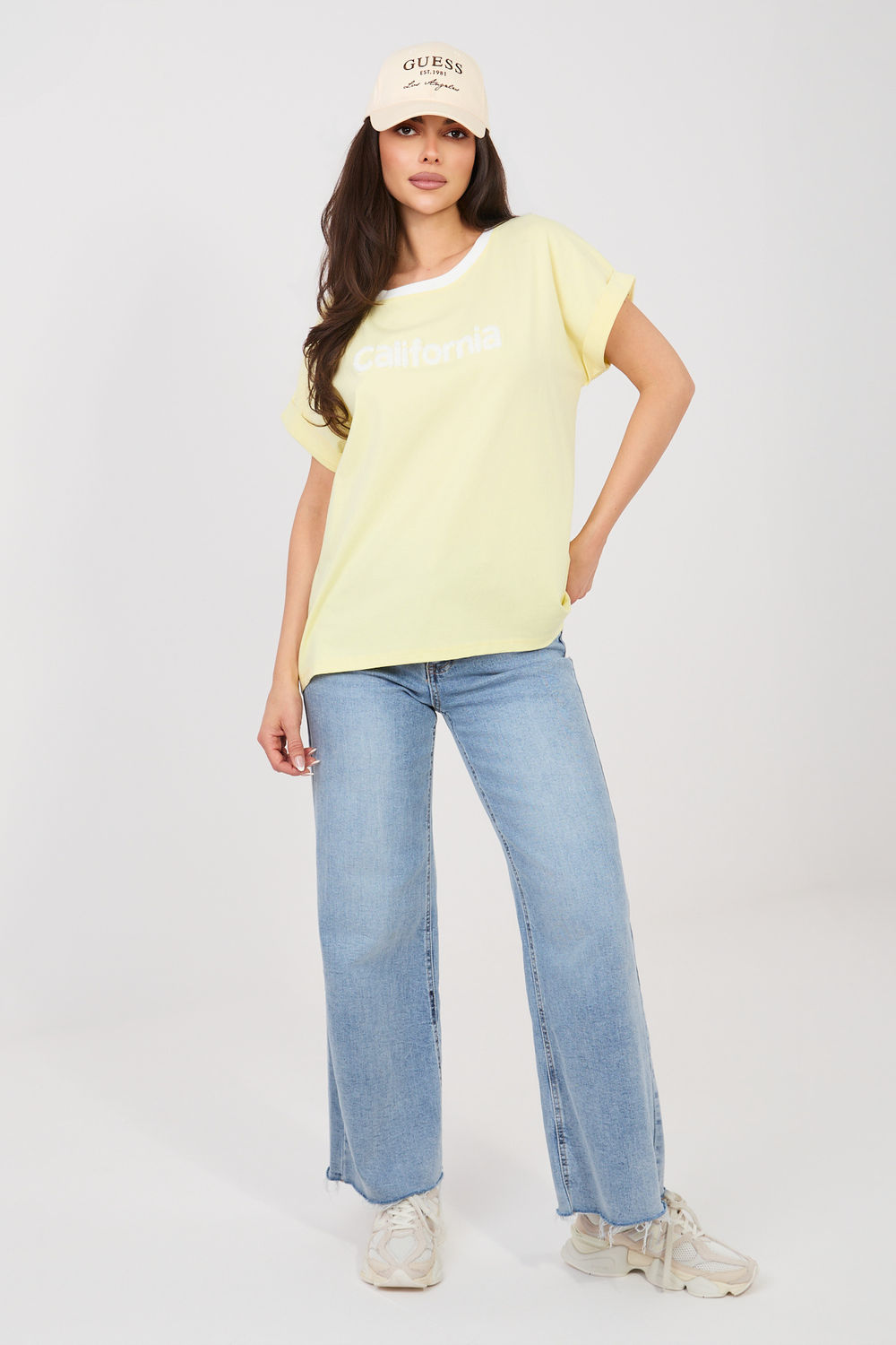 Stijlvol en comfortabel dagelijks shirt in een casual outfit, ideaal voor dagelijkse styling. Het model heeft een klassieke, ronde halslijn afgewerkt met een contrastrijke bies, die subtiel de neklijn benadrukt en karakter toevoegt aan het hele shirt. Het shirt is versierd met een verhoogde tekst aan de voorkant, die het dominerende element van het patroon vormt en het geheel een modieuze, moderne uitstraling geeft. De korte mouwen en standaard lengte zorgen voor draagcomfort, en dankzij het eenvoudige ontwerp valt het shirt losjes om het lichaam. Gemaakt van hoogwaardig katoen met een vleugje elastaan, de stof is zacht, aangenaam om aan te raken en licht elastisch, wat comfort garandeert gedurende de hele dag. Het model heeft geen sluiting, waardoor de eenvoud en functionaliteit van het ontwerp worden benadrukt.