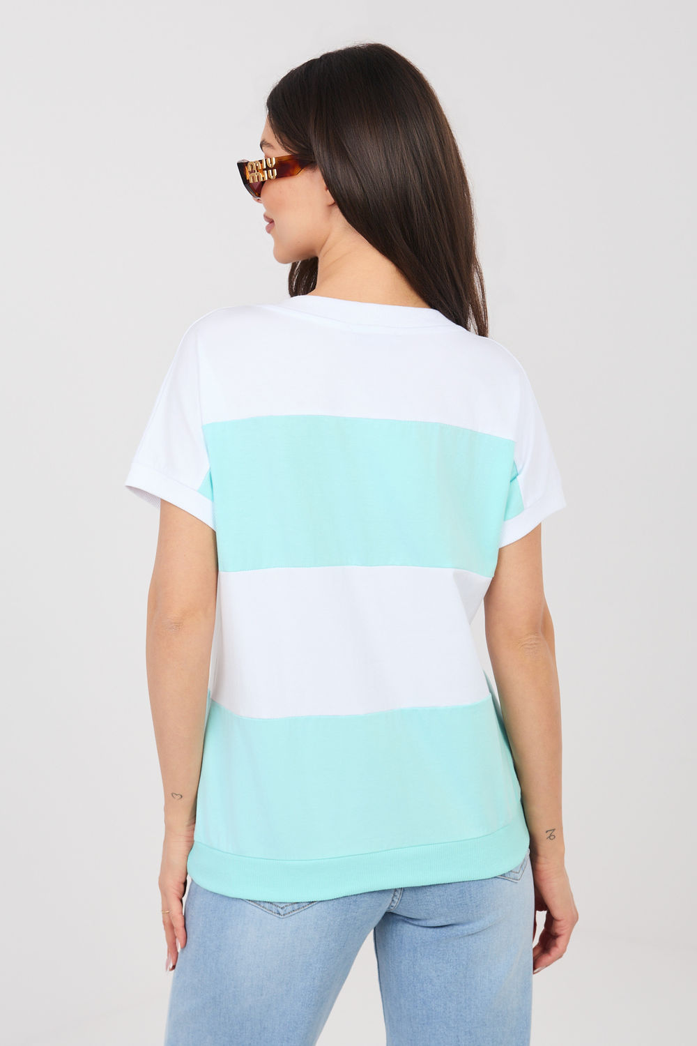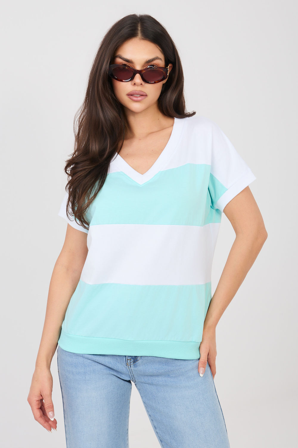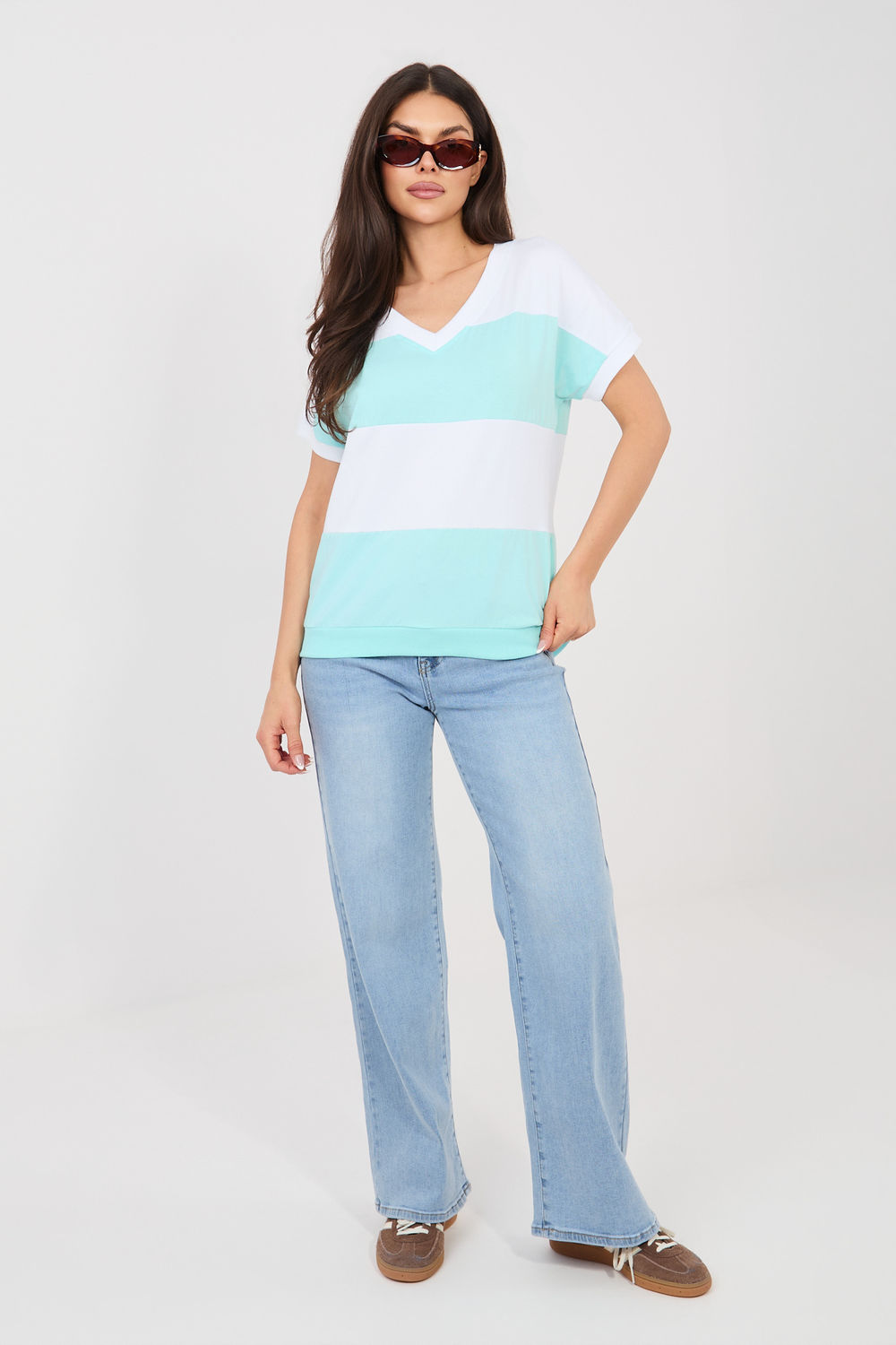 Stijlvolle damesblouse in een casual look, ideaal voor dagelijks gebruik. Het model van standaardlengte heeft korte mouwen en een vrouwelijke V-hals, die subtiel de neklijn benadrukt en lichtheid aan de hele outfit toevoegt. Het dominante element van het ontwerp zijn brede strepen die de blouse een modieus en tijdloos karakter geven. De eenvoudige, comfortabele pasvorm zorgt ervoor dat het model mooi op het lichaam valt en bewegingsvrijheid biedt tijdens dagelijks gebruik. De blouse is gemaakt van hoogwaardig katoen met een vleugje elastaan, waardoor de stof zacht, huidvriendelijk en licht elastisch is. Het model zonder sluiting benadrukt het comfortabele, dagelijkse karakter en zal goed passen bij veel casual outfits.