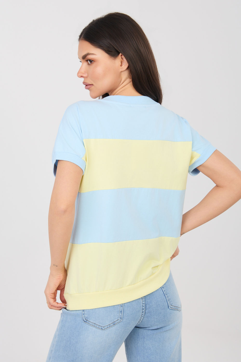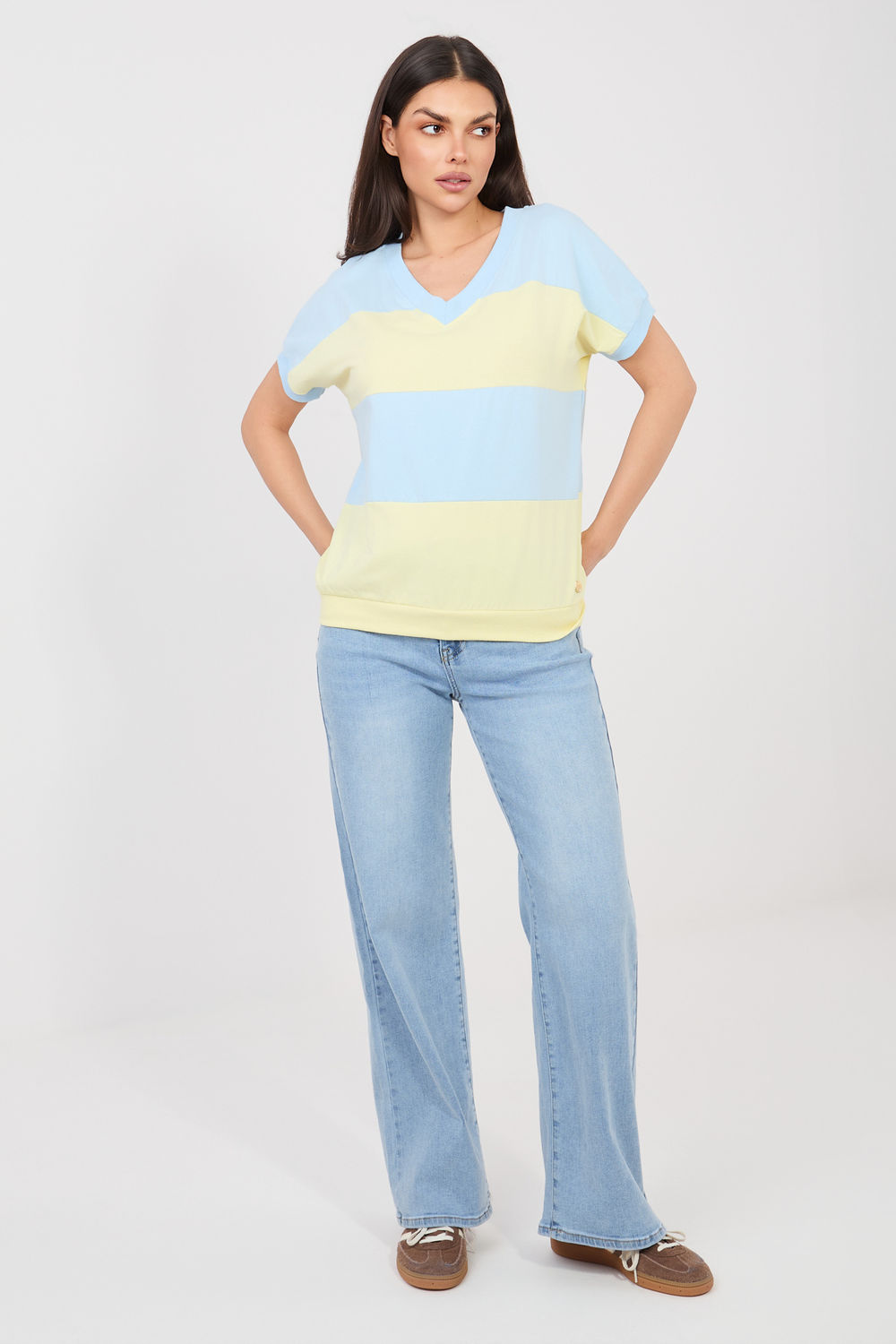 Stijlvolle damesblouse in een casual uitvoering, ideaal voor dagelijks gebruik. Het model van standaard lengte heeft korte mouwen en een vrouwelijke V-hals, die subtiel de neklijn benadrukt en lichtheid toevoegt aan de hele outfit. Het dominante ontwerpelement zijn brede strepen, die de blouse een modieus en tijdloos karakter geven. De eenvoudige, comfortabele pasvorm zorgt ervoor dat het model goed op het lichaam valt en bewegingsvrijheid biedt tijdens dagelijks gebruik. De blouse is gemaakt van hoogwaardig katoen met een vleugje elastaan, waardoor de stof zacht is, aangenaam voor de huid en licht elastisch. Het model zonder sluiting benadrukt het comfortabele, dagelijkse karakter en zorgt ervoor dat het goed past bij veel casual outfits.