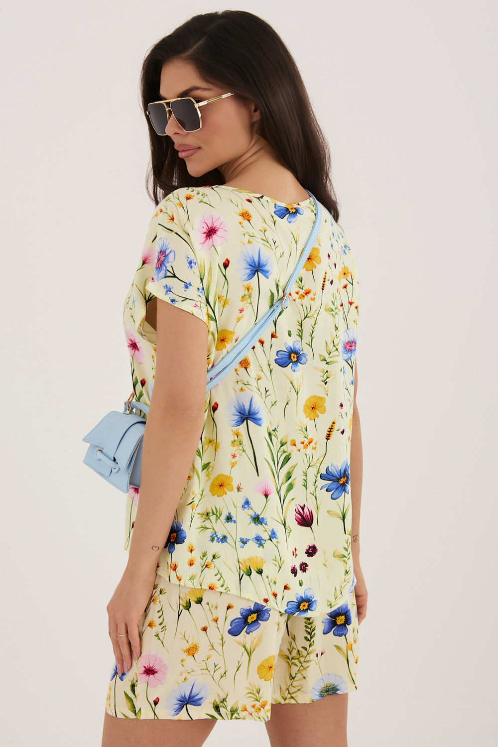 Een stijlvolle damesblouse met een alledaags karakter is een ideale keuze voor vrouwen die comfort en een modieuze uitstraling waarderen. Gemaakt van lichte, luchtige viscose, zal het perfect zijn voor warmere dagen, waardoor het de hele dag comfortabel te dragen is. Het model met standaardlengte en korte mouwen garandeert bewegingsvrijheid en een universele pasvorm voor verschillende silhouetten. De ronde hals geeft het geheel een klassiek, tijdloos karakter, waardoor de blouse perfect past bij alledaagse outfits. Bloemmotieven op de stof geven de blouse een bijzondere charme, die de look levendigheid en lichtheid geven. Een uitstekende keuze voor mensen die graag subtiele, maar opvallende accenten aan hun garderobe toevoegen. De blouse heeft geen sluiting, wat het gebruiksgemak vergroot. Ideaal voor dagelijks gebruik, past zowel bij jeans als bij een rok of shorts, waardoor het stijlvolle en comfortabele combinaties creëert.