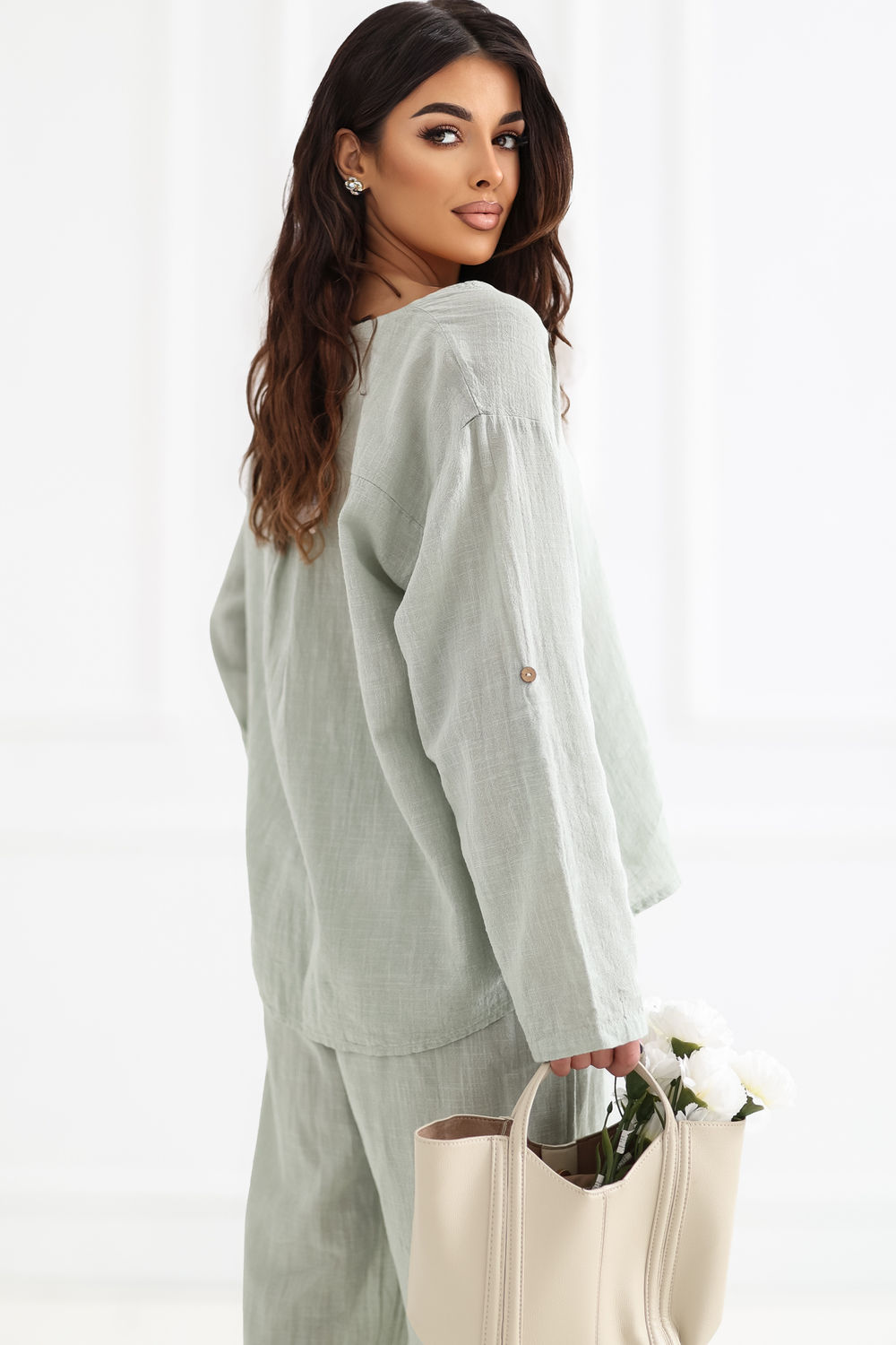 Shirt gemaakt van hoogwaardig katoen, dat comfort en ventilatie biedt gedurende de hele dag. Het model met een glad patroon maakt de blouse veelzijdig en gemakkelijk te combineren met vele outfits, zowel met jeans als met rokken. De blouse heeft een V-hals versierd met een subtiele knoop, wat haar een delicate, vrouwelijke uitstraling geeft. De standaardlengte zorgt ervoor dat deze goed past bij het silhouet en op vele manieren gedragen kan worden. Het model heeft lange mouwen die kunnen worden opgerold, waardoor de blouse gemakkelijk aangepast kan worden aan het weer en de outfit. Geen sluiting maakt het gemakkelijk en snel aan te trekken, ideaal voor dagelijkse gelegenheden.