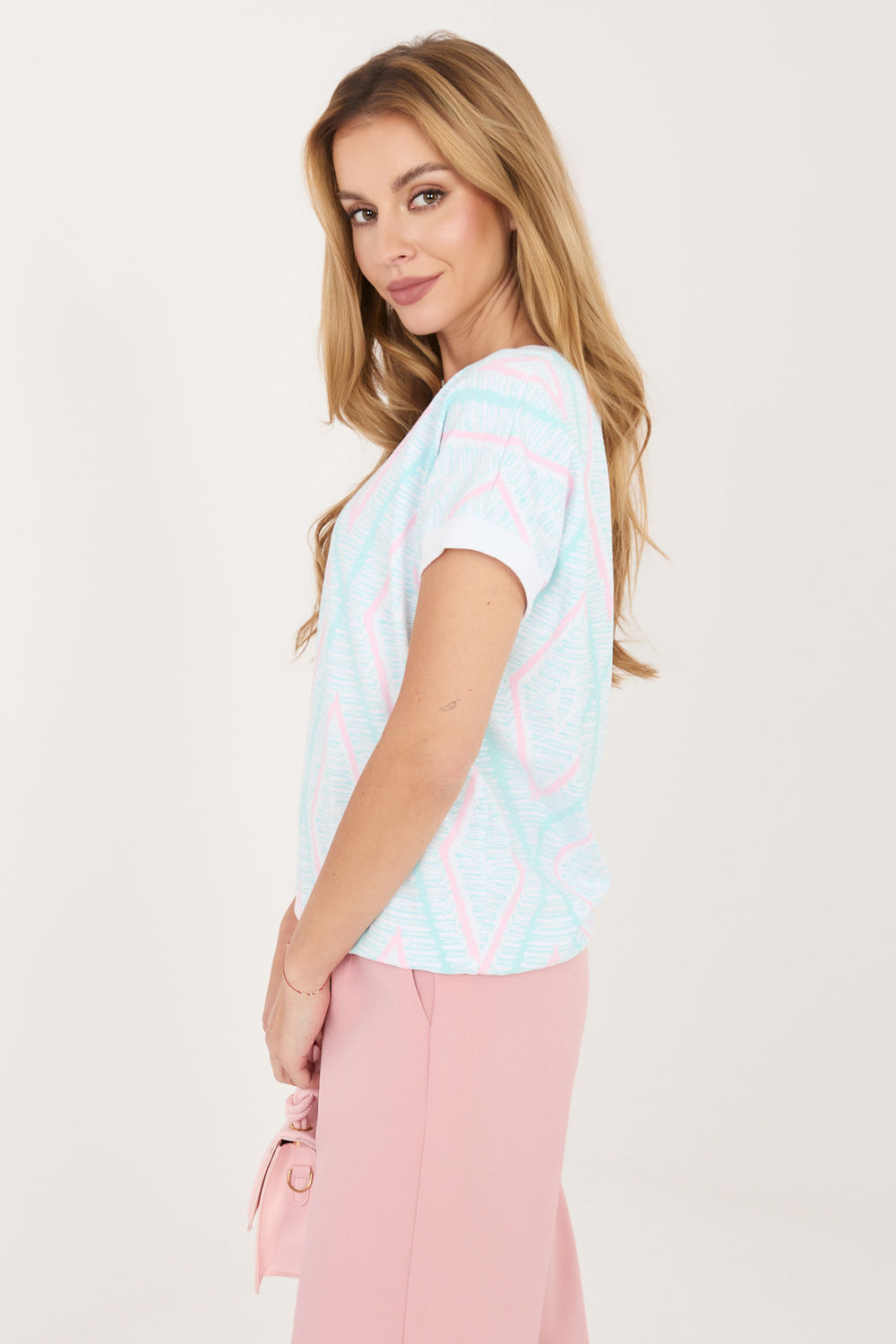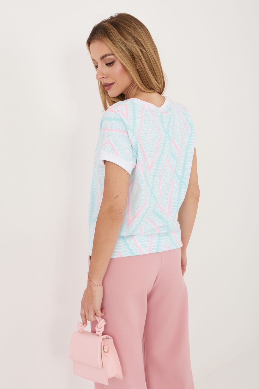 Damesblouse met een alledaags karakter is een comfortabel en stijlvol voorstel voor verschillende gelegenheden. Gemaakt van een aangename mix van katoen en elastaan, zorgt het voor draagcomfort, goede ventilatie en lichte elasticiteit, waardoor het zich aanpast aan de silhouet. Het model onderscheidt zich door een geometrisch patroon dat het een modern en expressief karakter geeft. De standaard lengte zorgt ervoor dat de blouse goed past bij zowel broeken als rokken. Korte mouwen en een ronde hals benadrukken subtiel het vrouwelijke silhouet en voegen lichtheid toe aan de hele outfit. Het ontbreken van sluitingen verhoogt het gebruiksgemak en maakt het model gemakkelijk aan te trekken. Dit is een universele blouse ideaal voor dagelijks gebruik, perfect voor zowel werk als minder formele gelegenheden.