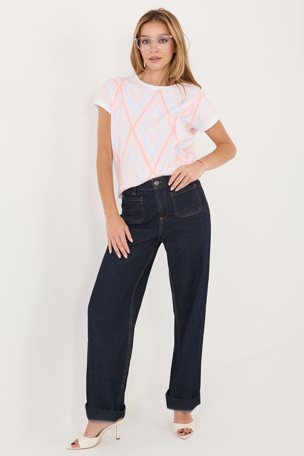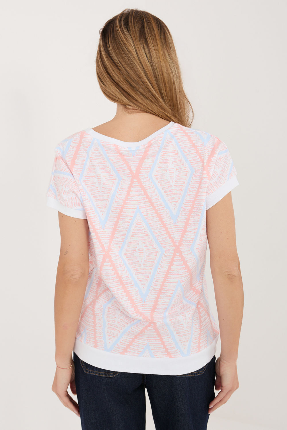 Damesblouse met een alledaags karakter is een comfortabel en stijlvol voorstel voor verschillende gelegenheden. Gemaakt van een aangename mix van katoen en elastaan, zorgt voor draagcomfort, goede luchtdoorlatendheid en lichte elasticiteit, waardoor het zich aanpast aan de silhouet. Het model onderscheidt zich door een geometrisch patroon, dat het een moderne en uitgesproken karakter geeft. De standaardlengte maakt de blouse perfect te combineren met zowel broeken als rokken. Korte mouwen en een ronde hals accentueren subtiel het vrouwelijke silhouet en voegen lichtheid toe aan de hele outfit. Geen sluiting verhoogt het gebruikscomfort en maakt het model gemakkelijk aan te trekken. Het is een universele blouse ideaal voor dagelijks gebruik, perfect voor zowel werk als minder formele uitstapjes.