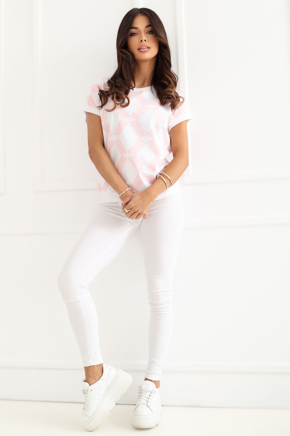 Damesblouse met een alledaags karakter is een comfortabel en stijlvol voorstel voor verschillende gelegenheden. Gemaakt van een aangename mix van katoen en elastaan, zorgt het voor comfortabel dragen, goede ventilatie en lichte elasticiteit, waardoor het zich aanpast aan de silhouet. Het model onderscheidt zich door een geometrisch patroon, dat het een modern en opvallend karakter geeft. De standaard lengte maakt de blouse perfect te combineren met zowel broeken als rokken. Korte mouwen en een ronde hals benadrukken subtiel het vrouwelijke silhouet, waardoor de hele styling lichter wordt. Het ontbreken van sluitingen verhoogt het gebruiksgemak en maakt het model gemakkelijk aan te trekken. Dit is een universele blouse die perfect is voor dagelijks gebruik, ideaal voor zowel werk als minder formele gelegenheden.