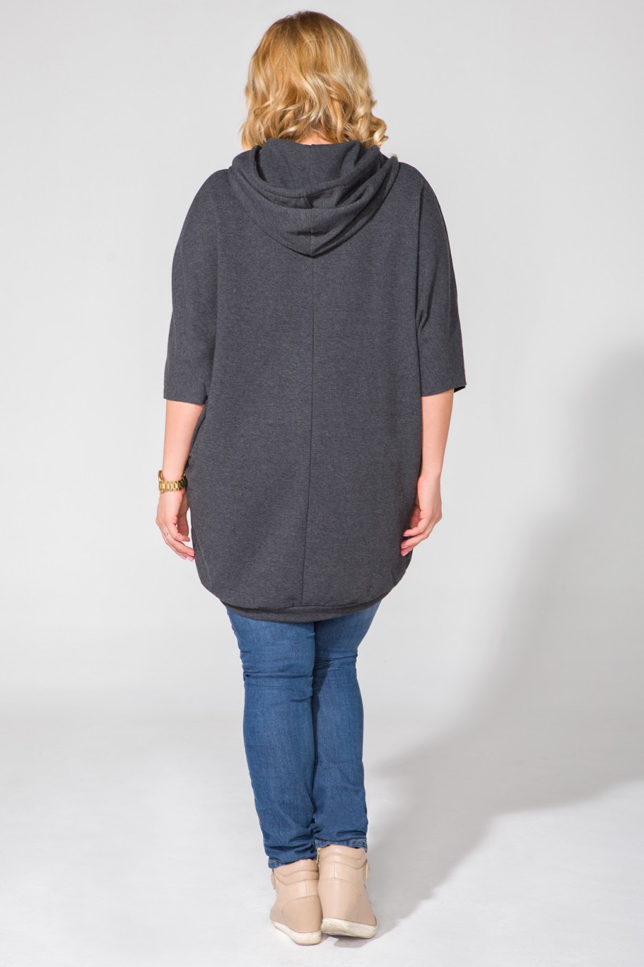 Blouse van sweatstof met een wijde snit. Rug voorzichtig gestrekt. Mouw gelaten in de ruwe staat. Blouse past dames maat 44-56.