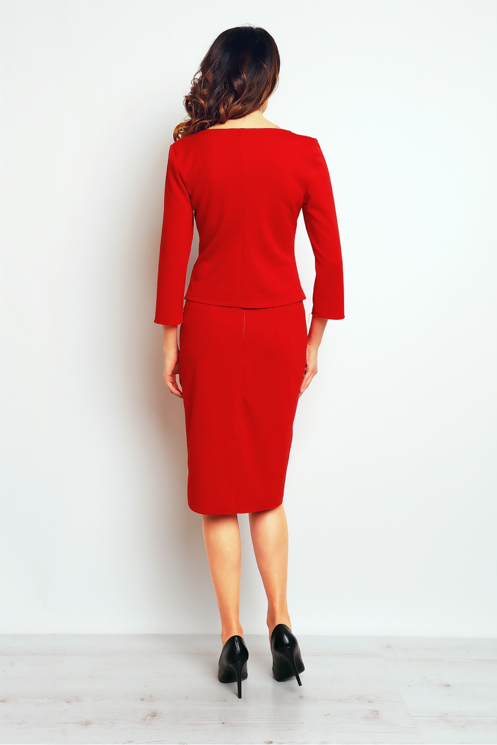 Indrukwekkende, uiterst vrouwelijke bloes met 3/4 mouwen. De halsuitsnijding laat de hals subtiel zien en loopt in de taille iets taps toe. Hoogwaardige stof met een interessante structuur zorgt voor draagcomfort. Gecombineerd met een kokerrok ontstaat een elegante styling, ideaal voor werk of officiële bijeenkomsten. Met een pantalon krijgt het daarentegen een iets nonchalanter karakter.