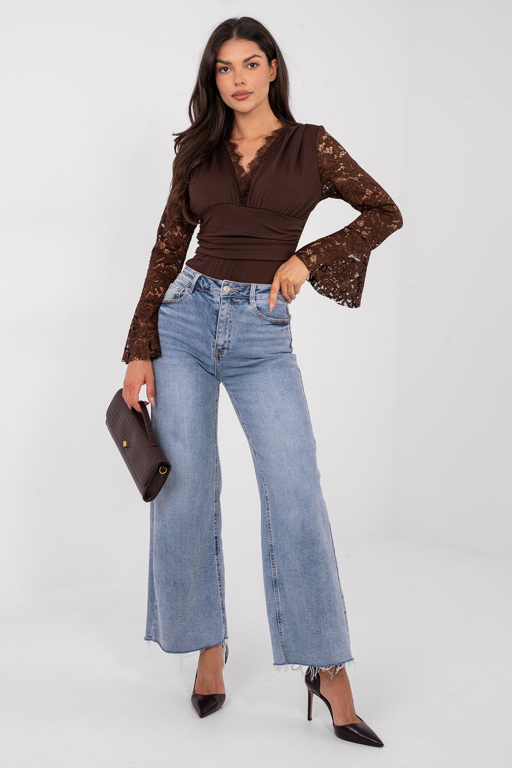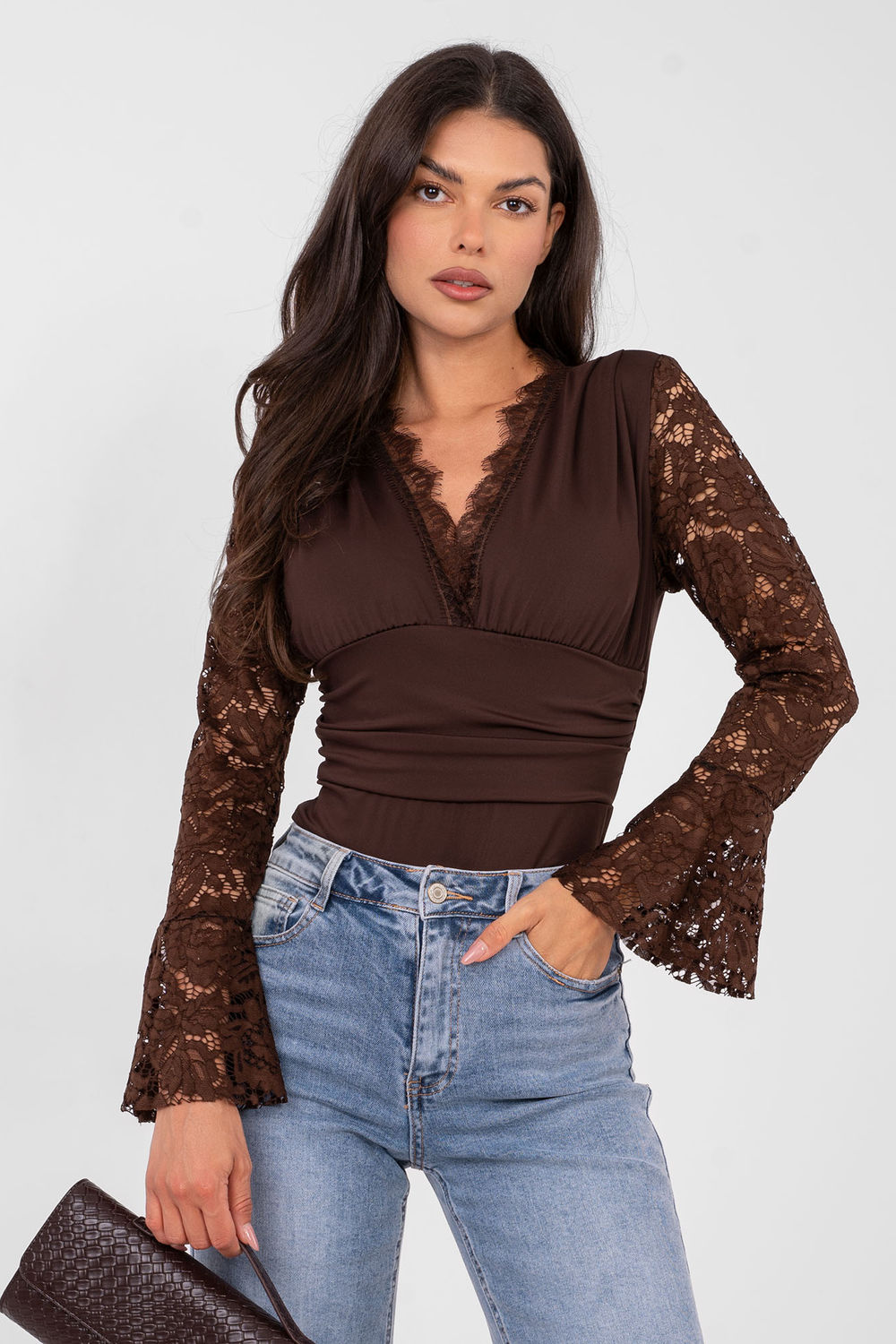 Stijlvolle body gemaakt van een combinatie van polyester en elastaan, die comfort combineert met verfijnde stijl. Het model met een standaard lengte en een hartvormige halslijn benadrukt het silhouet en geeft het geheel subtiel vrouwelijk karakter. De lange, wijd uitlopende mouw van kant voegt lichtheid en elegantie toe, terwijl de decoratieve plooien op de stof aan de voorkant een stijlvol detail vormen dat de body onderscheidt. Ingebouwde, verstevigde cups en een handige sluiting met haakjes zorgen voor een hoge functionaliteit, waardoor het aan- en uittrekken gemakkelijker wordt. Het overheersende effen patroon maakt de body veelzijdig en ideaal voor zowel speciale gelegenheden als voor elegante dagelijkse outfits.