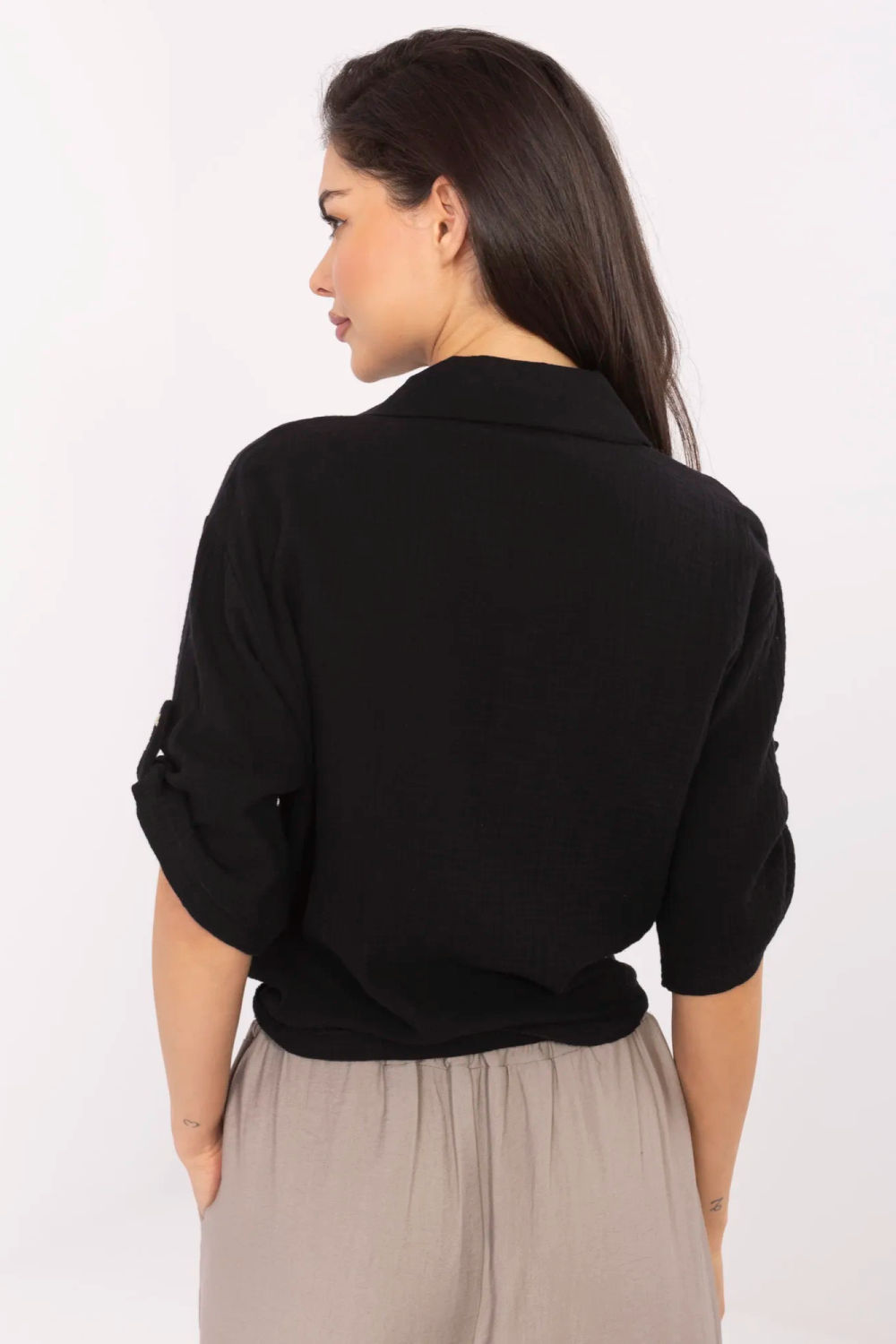 Stijlvolle damesblouse in een casual stijl, ideaal voor dagelijks gebruik. Gemaakt van luchtige, natuurlijke katoen, zorgt voor comfortabel dragen gedurende de hele dag. De korte lengte en het strikje onderaan geven het een luchtig en meisjesachtig karakter, terwijl de 3/4 mouwen perfect zijn voor warmere dagen. De blouse sluit met knopen en heeft een klassieke kraag, wat zorgt voor een universele, relaxte uitstraling. Op borsthoogte bevindt zich een praktisch zakje versierd met een subtiel ontwerp, dat een delicate en tegelijkertijd modieuze accent toevoegt.