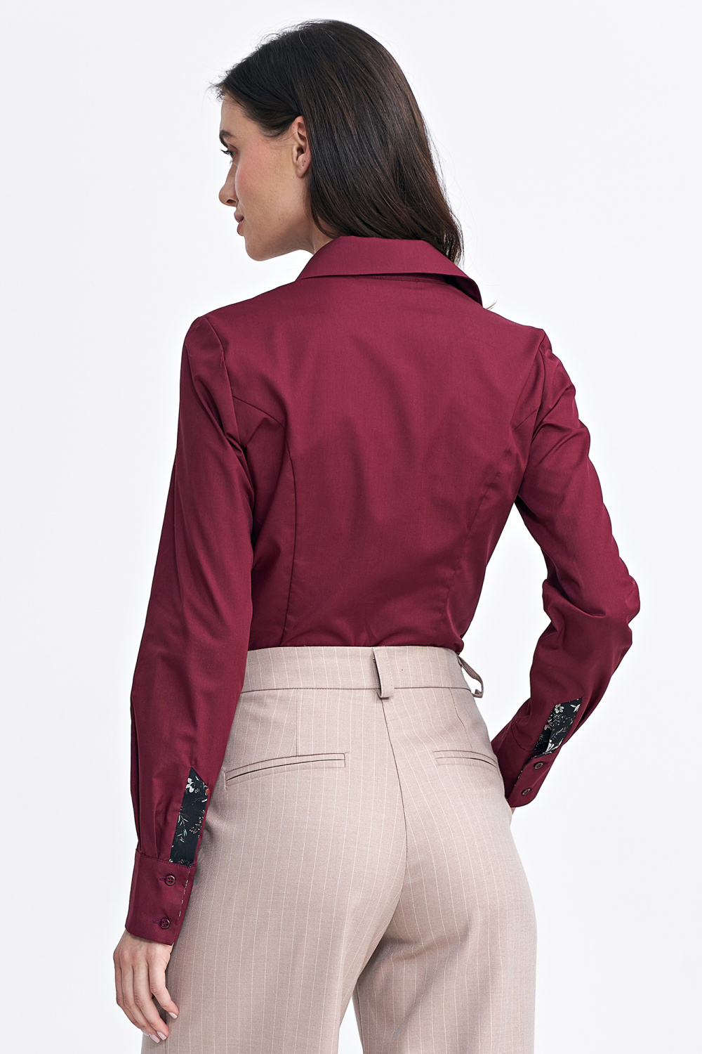 Dames overhemd, met een slim-fit snit die het silhouet perfect accentueert. Het is gemaakt van hoogwaardige overhemdstof en is elegant en comfortabel. De klassieke kraag geeft het een tijdloze stijl, terwijl de lange mouwen die eindigen in manchetten een formele touch toevoegen. Het overhemd is aan de voorkant dichtgeknoopt, wat de klassieke esthetiek versterkt. Als extraatje geven subtiele contrasterende bloemeninzetten aan de binnenkant van de manchetten, bij de sluiting en bij de kraag een originele touch aan de algehele look.
