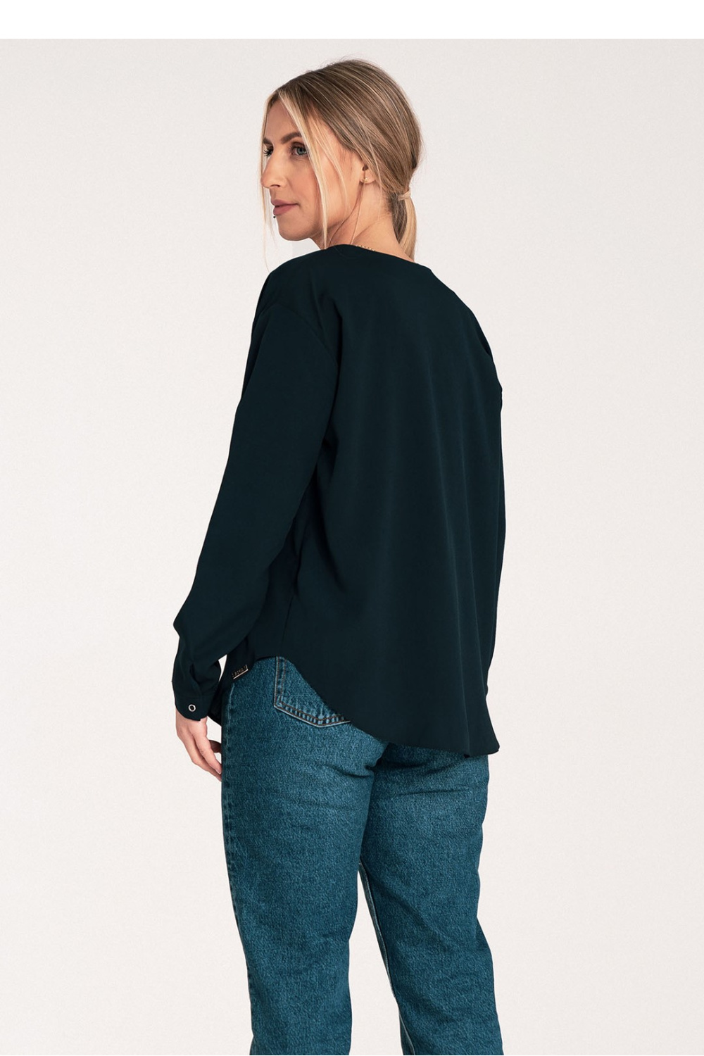 Shirt met lange mouwen en manchetten met drukknopen. Brutale halslijn, geen kraag. Shirt sluit aan de voorkant met drukknopen.