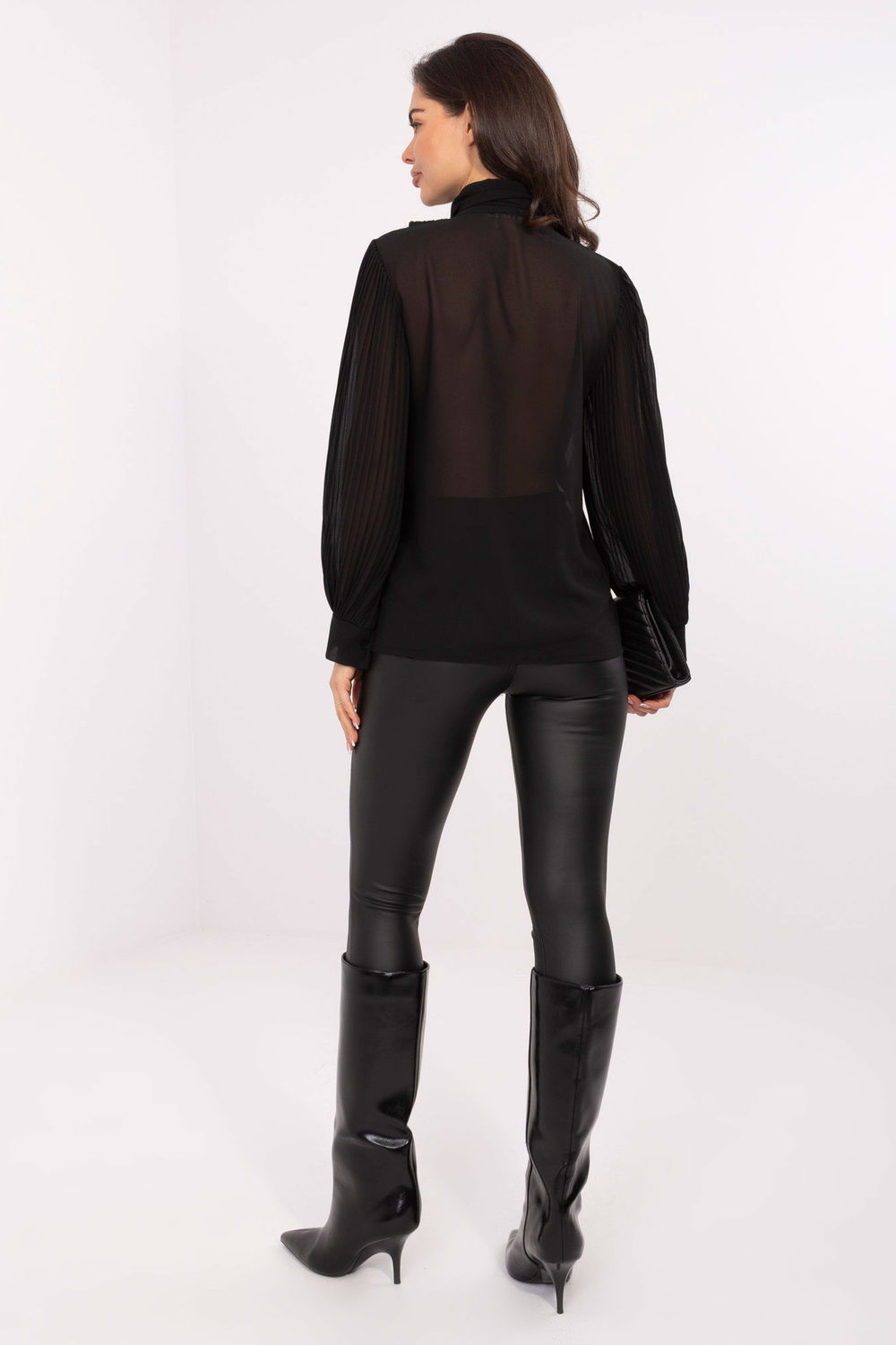 Modieuze en vrouwelijke damesblouse, die perfect is voor zowel dagelijks gebruik, op het werk als bij speciale gelegenheden. Gemaakt van een hoogwaardige mix van polyester en elastaan, is licht, elastisch en prettig om aan te raken, waardoor het comfortabel is om de hele dag te dragen. Het model heeft een klassieke kraag en knoopsluiting die hem een elegante, tijdloze uitstraling geven. De geplooide jabot met strik aan de voorkant trekt de aandacht en voegt een spectaculaire, vrouwelijke touch toe. Lange, geplooide mouwen maken het geheel subtiel en voegen een uitzonderlijke klasse toe aan de blouse. Dankzij de gladde stof en standaardlengte ziet de blouse er geweldig uit in combinatie met zowel een rok als broek, waardoor het een stijlvolle outfit is voor op kantoor of speciale gelegenheden.