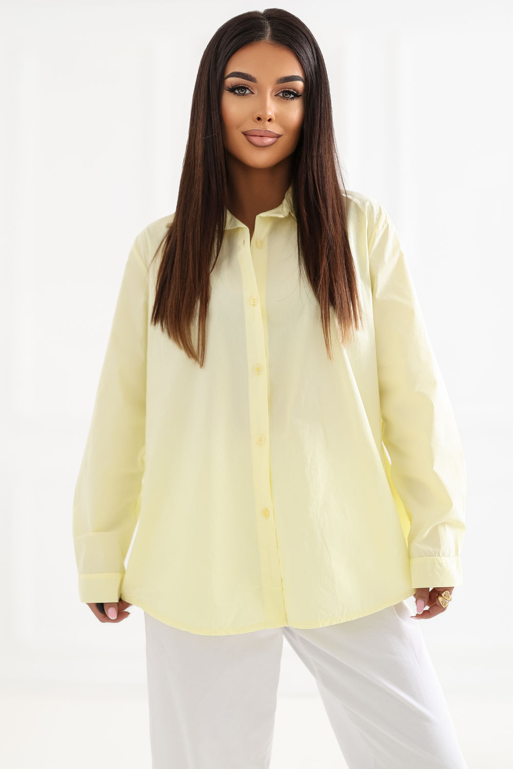 De klassieke damesblouse is een tijdloos kledingstuk dat zowel overdag als op het werk perfect past. In een elegante stijl combineert het eenvoud en klasse, waardoor je het gemakkelijk kunt aanpassen aan verschillende gelegenheden. Het model, gemaakt van hoogwaardig katoen, zorgt voor comfortabel dragen gedurende de hele dag en ademend vermogen, wat vooral belangrijk is bij dagelijks gebruik. Het gladde patroon geeft de blouse een universeel karakter, waardoor je deze gemakkelijk kunt combineren met andere kledingstukken, zowel met stoffen broeken als met een rok. De blouse heeft een standaard lengte en lange mouwen, wat het klassieke ontwerp benadrukt. Voorzien van een elegante kraag en praktische knoopsluiting, ziet het er netjes en professioneel uit. Het is de ideale keuze voor vrouwen die comfort, stijl en tijdloze elegantie waarderen.