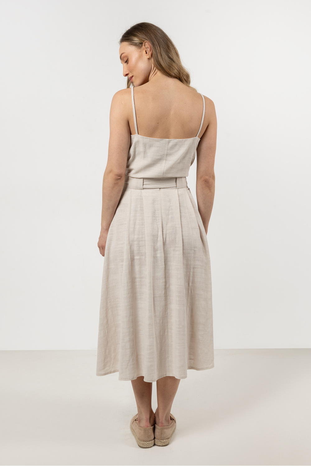 Minimalistisch en universeel, deze top is een must-have voor warme dagen. Gemaakt van natuurlijke, zachte katoen, biedt het ademend vermogen en comfort tijdens het dragen. Dunne schouderbandjes benadrukken subtiel de schouders, en de lengte tot de heupen maakt dat het perfect te combineren is met zowel rokken als broeken. Het is geweldig voor zowel casual als elegante outfits. Combineer de top met een rok van dezelfde stof of met bermuda’s. Je creëert een comfortabele zomerset.