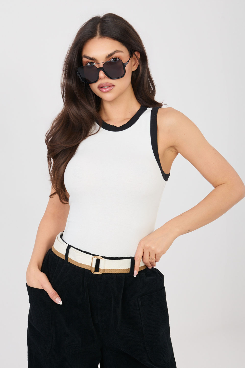 Het damesshirt in topstijl is een ideaal voorstel voor liefhebbers van casual, dagelijkse outfits. Het mouwloze model met klassieke ronde hals accentueert mooi de armen en de silhouet, en biedt tegelijkertijd volledig draagcomfort. De top is gehouden in een minimalistisch, glad patroon dat het een universeel karakter geeft. Een bijzonder accent zijn de contrasterende biezen bij de halslijn en de uitsparingen op de schouders, die het geheel een moderne, licht sportieve uitstraling geven. Gemaakt van hoogwaardig katoen met een vleugje elastaan, is het materiaal aangenaam om aan te raken, elastisch en past goed bij het lichaam. Een uitstekende keuze voor dagelijks gebruik, het past goed bij jeans, shorts of een hoge taille rok. Elastisch materiaal.