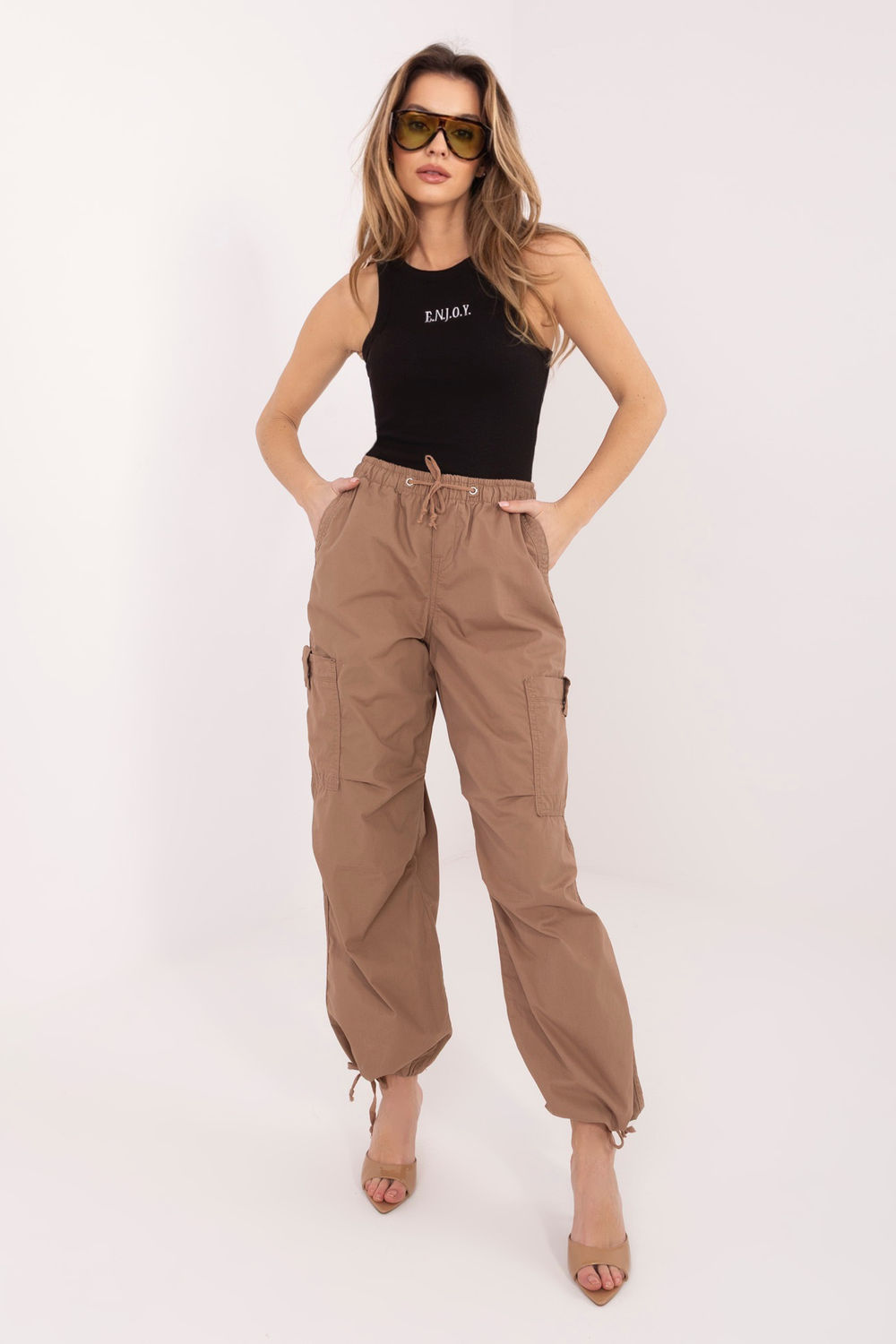 Moderne casual dames top is een must-have in de zomer en voor dagelijkse outfits. Gemaakt van een hoogwaardige mix van katoen en elastaan, biedt het comfortabel dragen, lichtheid en een zachte pasvorm aan de silhouet. Het model is van standaard lengte, zonder mouwen, perfect voor warme dagen of als basis voor lichte lagen. De ronde hals geeft een klassiek, universeel karakter en het geribbelde materiaal voegt een trendy, subtiel textuureffect toe aan de top. Aan de voorkant is een geborduurde tekst te vinden, die een stijlvol accent vormt en het individuele karakter van het model benadrukt. De top past perfect bij jeans, shorts of een rok, waardoor comfortabele en moderne outfits voor elke dag worden gecreëerd.