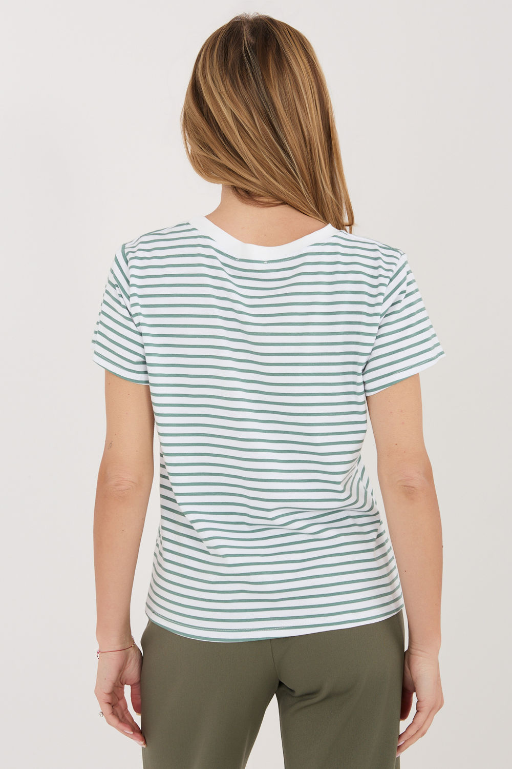 Stijlvolle dames T-shirt met tijdloze strepen, ideaal voor dagelijkse, casual outfits. Het klassieke patroon maakt het perfect te combineren met zowel jeans als meer elegante kledingstukken. Gemaakt van een hoogwaardige mix van katoen en elastaan, zorgt voor comfortabel dragen, zachtheid en een goede pasvorm op het lichaam. De standaard lengte en korte mouwen maken het een veelzijdige keuze voor elk seizoen. Het model heeft een ronde hals, die het klassieke karakter van het T-shirt benadrukt. Het geheel wordt aangevuld met een subtiele, decoratieve borduurwerk in de vorm van een hart, geplaatst aan de linkerkant op borsthoogte, wat charme en een vrouwelijk accent toevoegt.