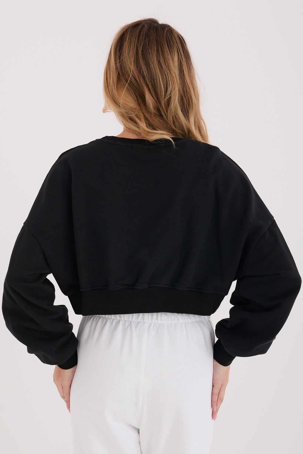 Dames sweater in casual stijl is een uitstekende keuze voor vrouwen die comfort en een modieuze uitstraling waarderen. Het kortere model geeft het een moderne uitstraling en past perfect bij broeken en rokken met een hoge taille. Het model heeft lange mouwen en een klassieke, ronde hals, wat zorgt voor comfortabel dragen en veelzijdigheid in styling. Door het ontbreken van sluitingen is de trui praktisch en gemakkelijk aan te trekken. Aan de voorkant zijn decoratieve opschriften te vinden die het geheel een opvallend, modieus accent geven en het casual karakter van het model benadrukken. De trui is gemaakt van een hoogwaardige mix van katoen en elastaan, waardoor de stof zacht, elastisch en prettig voor de huid is. Het is een ideale keuze voor dagelijkse, casual outfits die comfortabel, stijlvol en tijdloos zijn.