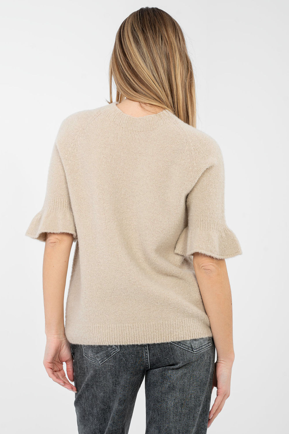 Casualowy damski sweter is een stijlvol en comfortabel voorstel voor dagelijks gebruik en werk. Gemaakt van een aangename mix van acryl, polyamide en zachte baby alpaca, zorgt het voor draagcomfort, zachtheid en een esthetische uitstraling. Het model met standaard lengte en ronde hals ziet er klassiek en universeel uit. De korte mouw met een elegante ruche voegt een vrouwelijke charme en subtiele elegantie toe aan de trui. Het gladde patroon maakt het model gemakkelijk te combineren met veel verschillende outfits, zowel met elegante broeken of een rok voor werk, als met jeans voor dagelijks gebruik. De trui heeft geen sluiting, wat zijn minimalistische karakter benadrukt.