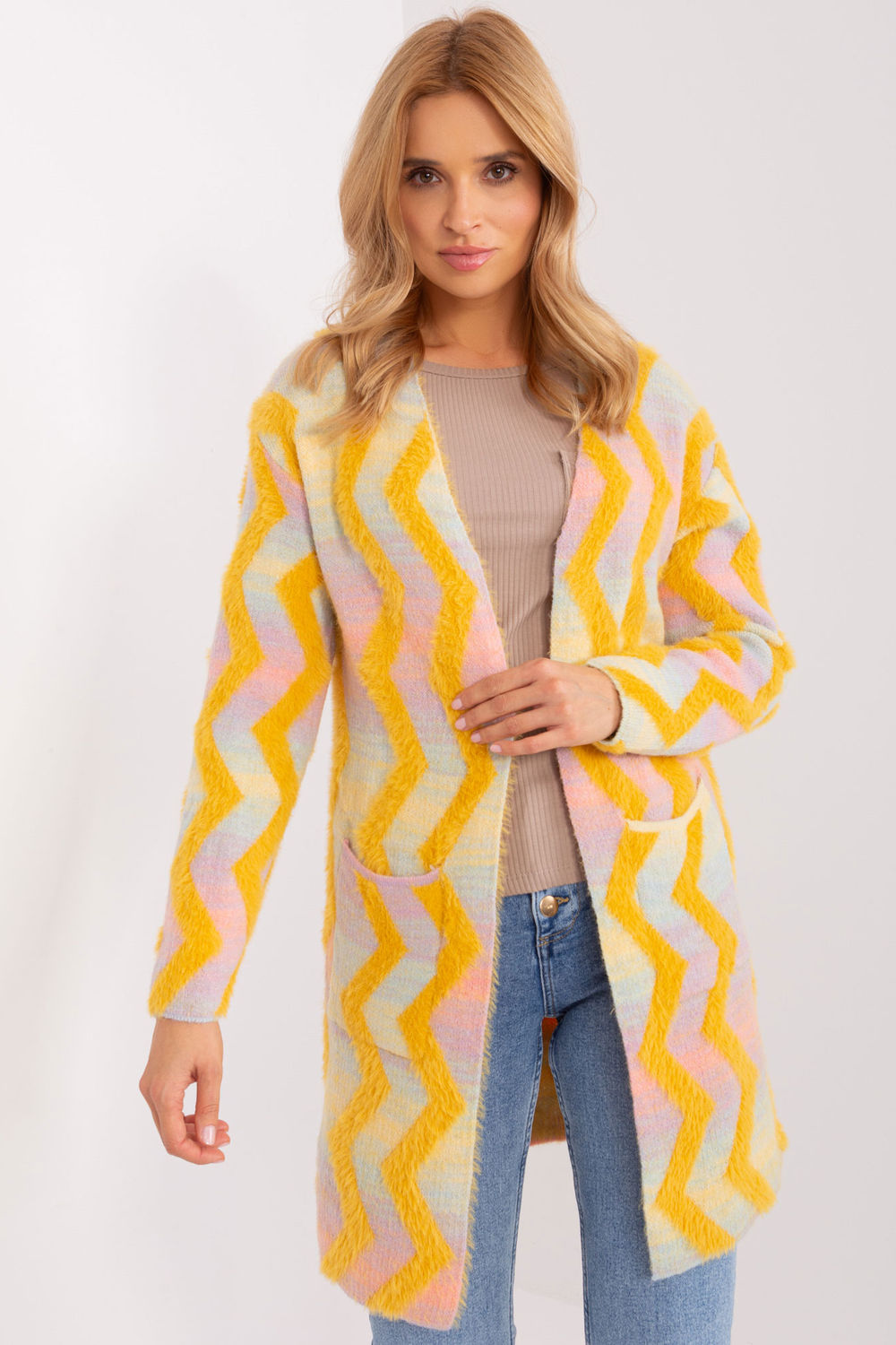 Dit vest is de perfecte keuze voor alledaagse styling. Het is gemaakt van zacht materiaal en heeft een comfortabele pasvorm. Het geometrische patroon voegt karakter toe en door het ontbreken van een sluiting is het gemakkelijk aan en uit te trekken. De lange mouw houdt je warm op koudere dagen en de standaardlengte maakt het geschikt voor een breed scala aan rokken, jurken en broeken. Het is een casual kledingstuk dat originaliteit toevoegt aan je alledaagse outfits.