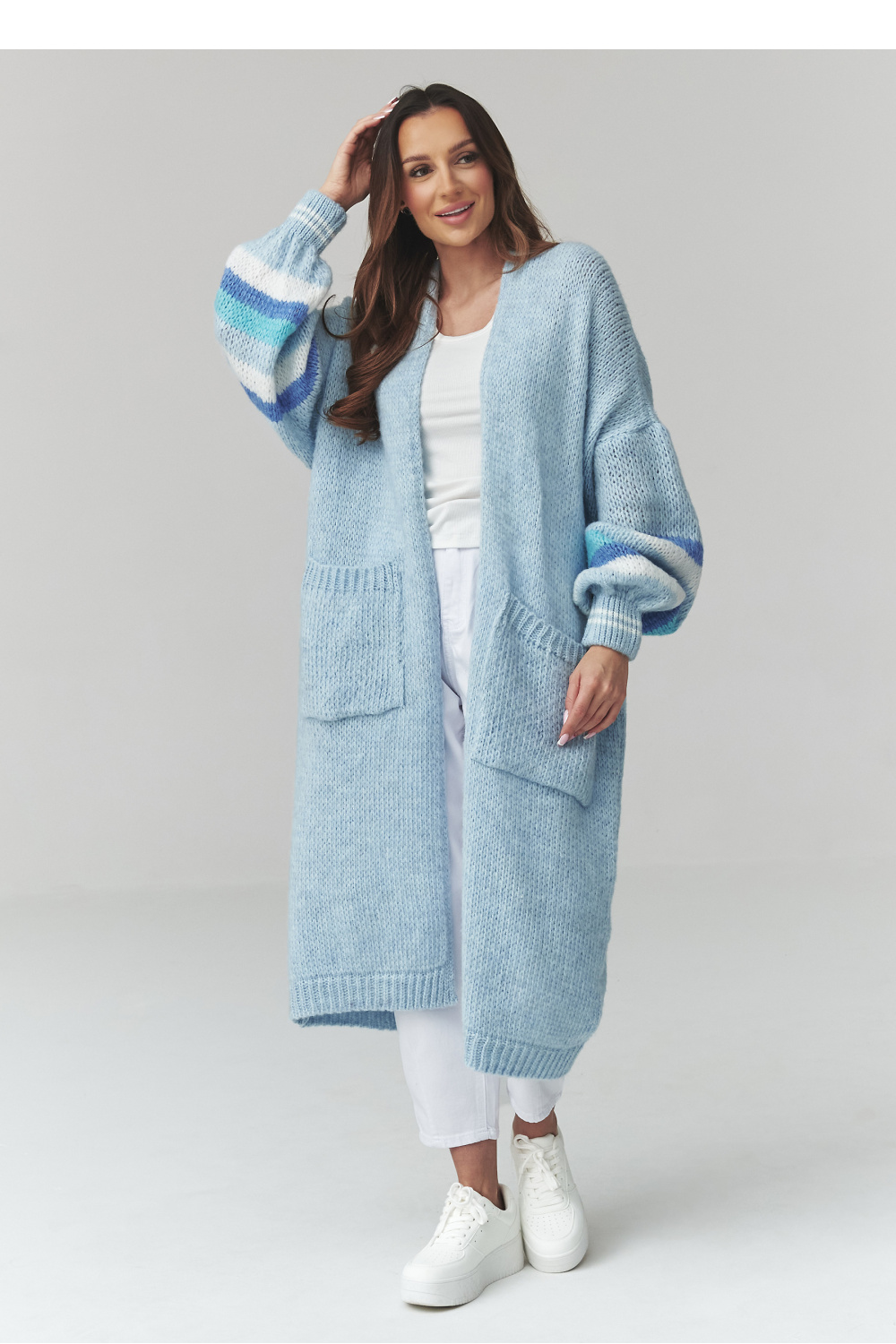 De lange dames trui is een ideaal voorstel voor vrouwen die comfort en stijl waarderen in hun dagelijkse outfits. Het model in de vorm van een dames vest onderscheidt zich door een losse pasvorm en aangenaam aanvoelende stof, waardoor het comfortabel is om de hele dag te dragen. De oversized trui past mooi op het lichaam en maakt het mogelijk om trendy, gelaagde outfits te creëren. De praktische vest met zakken combineert functionaliteit met een modieus design. Grote zakken geven het karakter, en de langere snit zorgt ervoor dat de lange dames vest perfect past bij zowel broeken als leggings of jurken. Het decoratieve patroon en de stijlvolle afwerking van de mouwen geven het een unieke uitstraling. Deze veelzijdige dames trui voor dagelijks gebruik past goed bij veel verschillende outfits, van casual tot meer elegante looks.